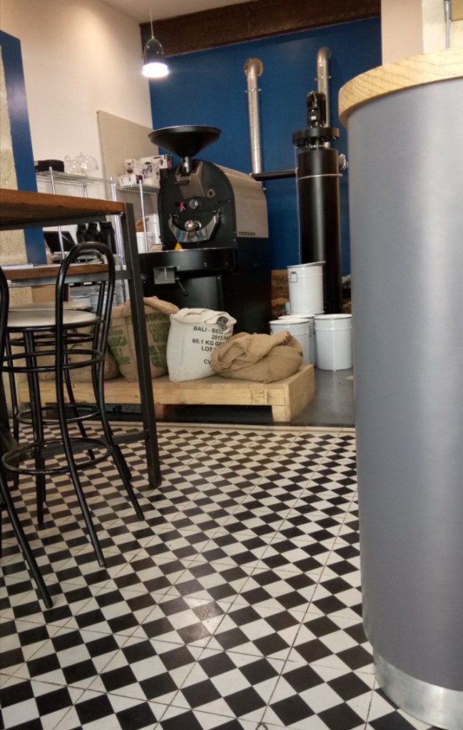 Below left is an image from an exhibition by Zebra3 / Michael Blazy at a shop space in the Place du Parlement that I took through the glass. See https://www.zebra3.org for more information. Below right was a novel display I noticed whilst having a coffee in La Pelle Cafe on Rue Notre Dame …using a glass teapot as a plant pot! The minimal styling worked really well within the cafe space[photographs above]. On another note, they served great coffee!