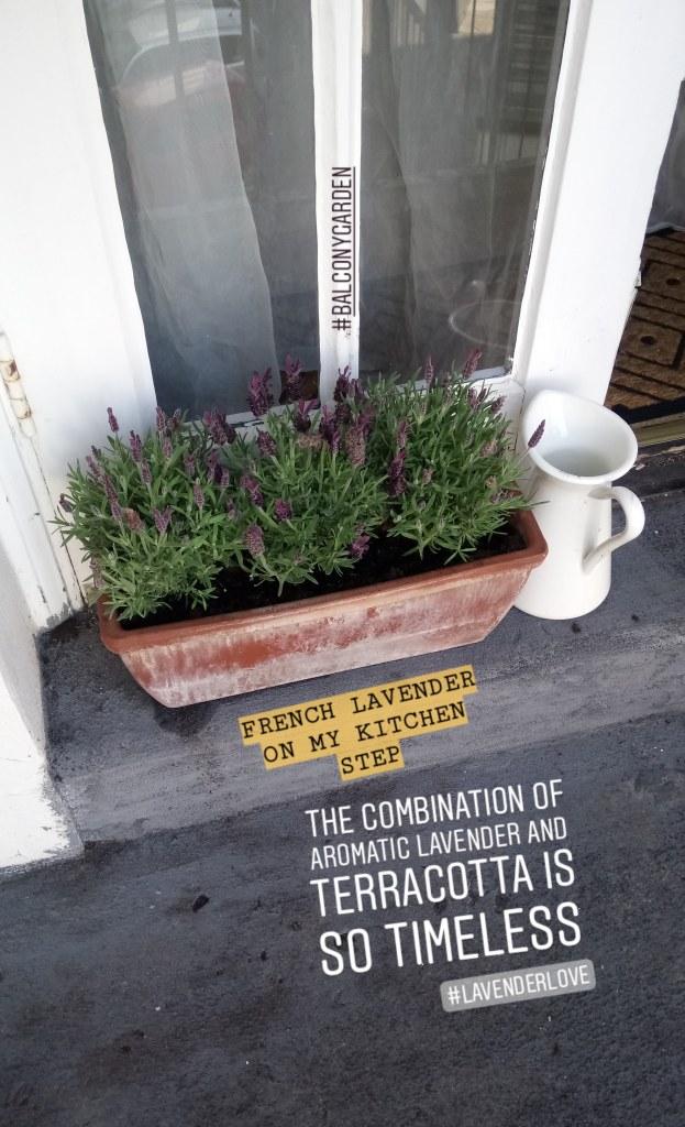 Here’s a flashback to an april weekend where I spent much of it potting on the balcony – the photograph above shows it freshly planted. Lavender on the kitchen step next to my old French doors (below) is a must for me and it’s also where I keep my outdoor watering jug. I love the combination of the earthy terracotta and classic french lavender that greets me on doorstep morning and night. The photo below left shows the potting of my pink geranium which usually lives on my window ledge to add a bubblegum pop to an otherwise dull corner.