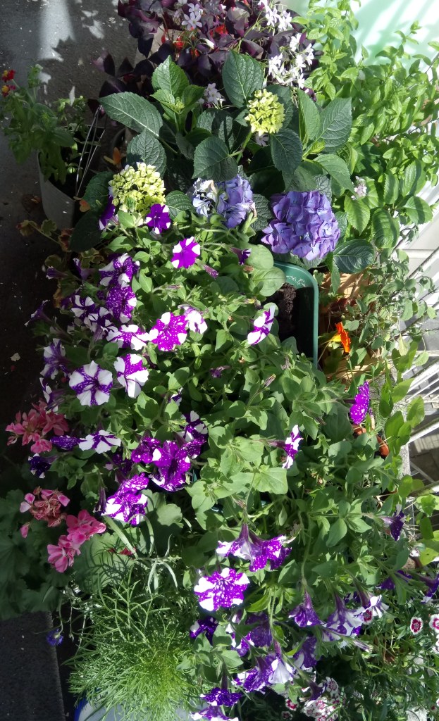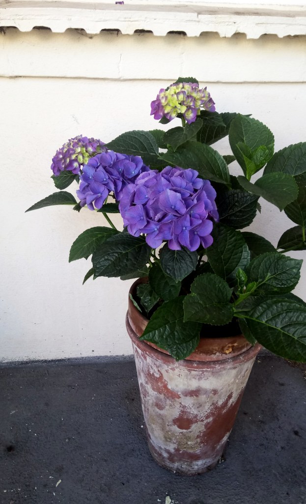 I am really enjoying my purply blue hydrangea that is starting to bloom now. I had never thought to grow these in a pot before this year and was a bit sceptical, but they are doing well so far.