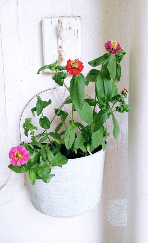 I also have this delicate trailing begonia duo from a plant sale that I need to pot on, and my zinnia are looking a bit chaotic but pretty in their planter: