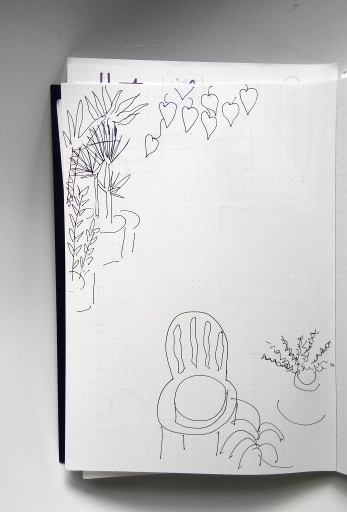 For the next part in this mini series, I wanted to share some of the design process after my initial visit to Newton House, and the purchasing of the plants for the space. As I alluded to in the previous post, the planning-on-paper side of things was a pivotal part in getting the feel of the room right – I did a number of drawings, some of which you will see below. On any project like this, the main consideration has got to be scale. The conservatory is narrow (6m x 3 m) but tall with a high glass roof so this precluded some low, wide spanning plants as I didn’t think this would suit the shape of the room well.