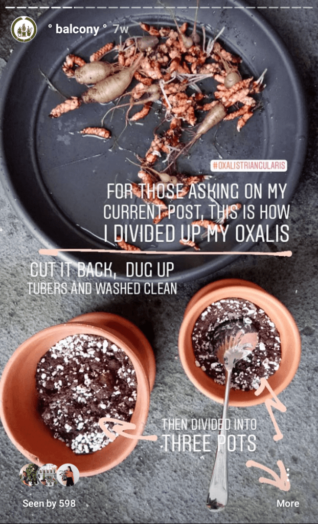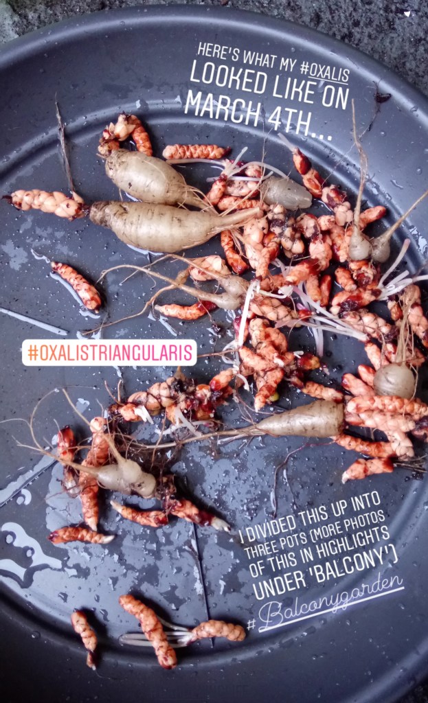 This year, I tried growing some of the tubers indoors, mainly because I kept seeing them on Instagram! To me, oxalis has always been a balcony plant, but as I had a lot of tubers, I divided them into three pots, putting two small ones indoors, and the larger pot outside. As pretty as they look in the photo above, I must say, I didn’t love mine indoors, they just seemed a bit sparse and spindly. I felt the the outdoor plant was slower, yet stronger and more compact, so next year I am not going to bother planting indoors with this – two pots on my balcony instead I think.