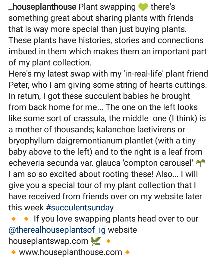 Receiving these succulent cuttings a few weeks ago from my (in real life) plant friend Peter got me thinking about the plants I have received from swaps since starting my Instagram page in August 2017. It also reminded me that I need to give Peter his string of hearts cuttings as my part of the ‘swap’ (sorry for the delay if you are reading this P!)