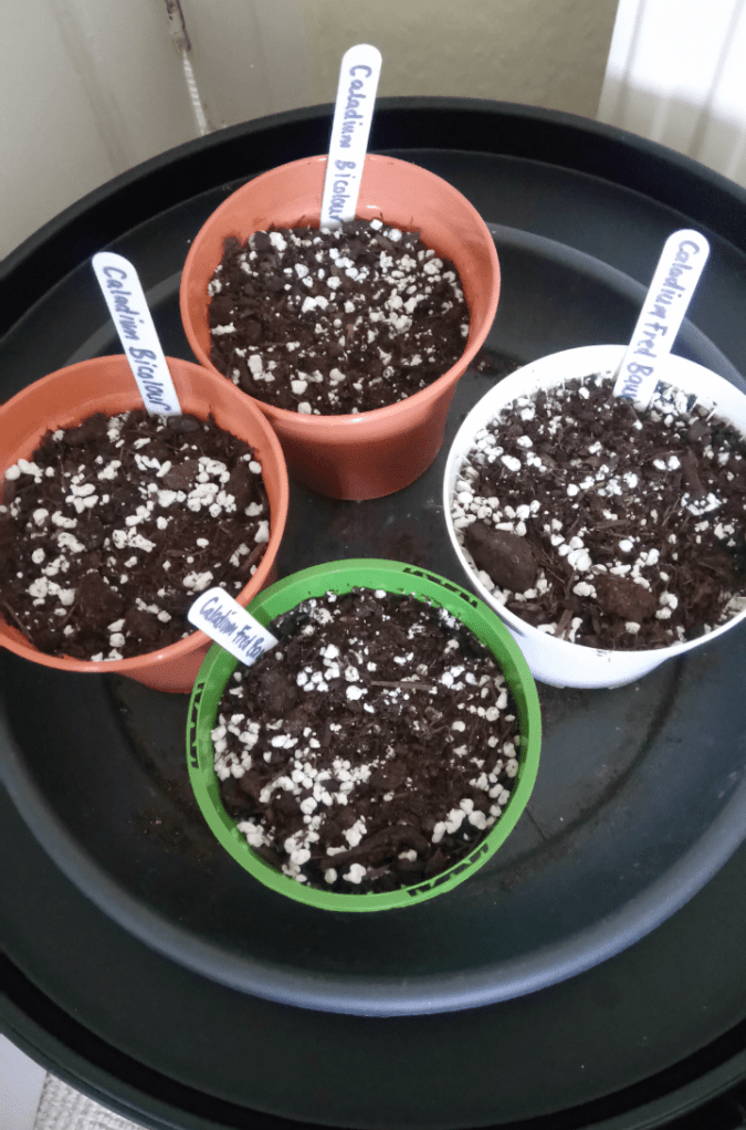 I moved the pots I started to see growth in to a brighter position and covered them with plastic freezer bags. I also have a small propagator (above left) I popped two of my humidity-loving caladiums in, and a glass dome which houses a small pot with a tiny colocasia jeningsii bulb. Granted, a table with pots covered in bags isn’t the most attractive of views, BUT it does help increase the humidity and warmth considerably, which in turn will encourage growth.