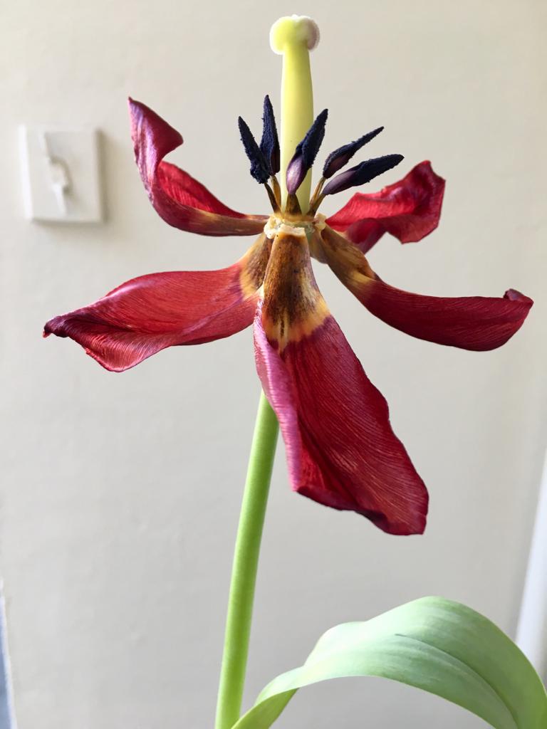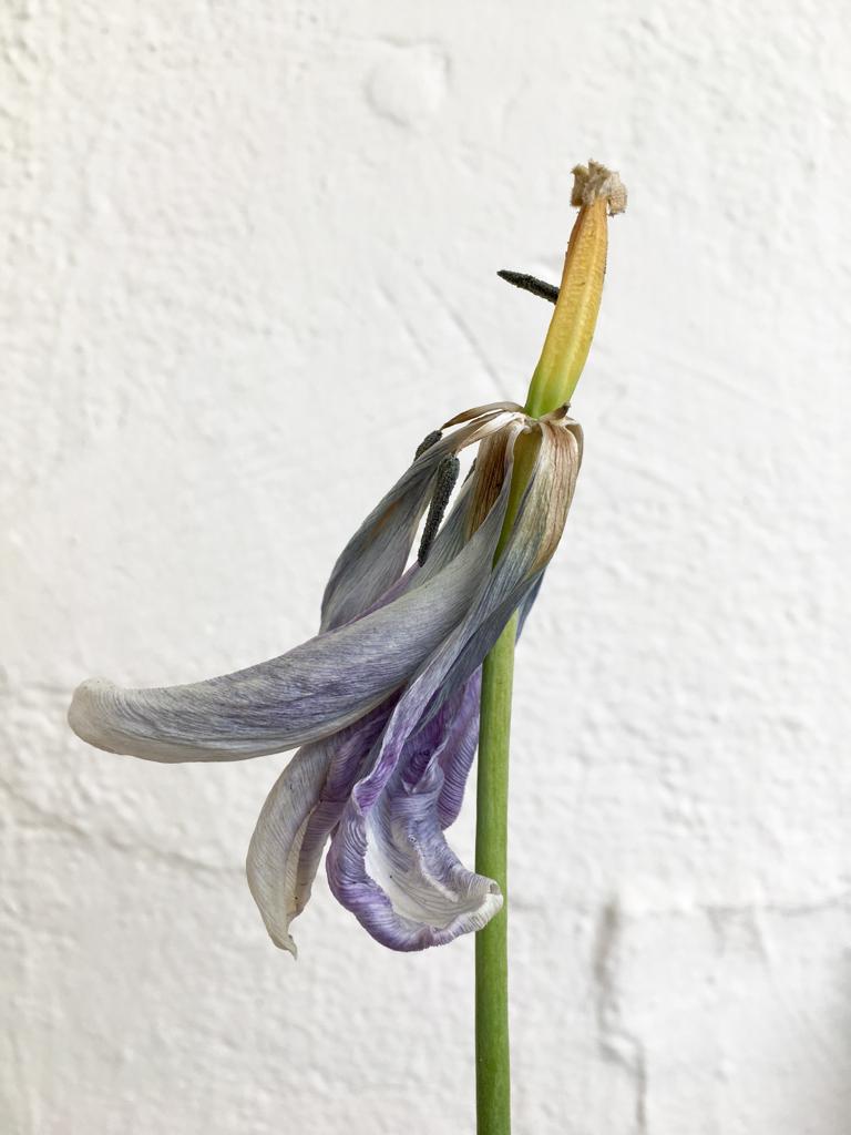 As tulip season fades on my balcony garden, I have been mesmerised by capturing their wilting beauty as they crinkle up into abstract forms quite far removed removed from their former glory. As the petals separate to reveal their often concealed inner structure, the once solid forms of colour have now become detached and open to the elements, which accounts for their fairly quick demise.