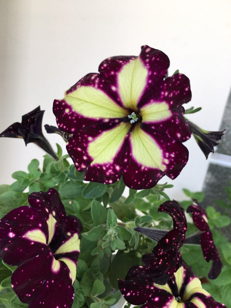 Last year things went a little petunia crazy online when a new variety appeared on the market; the night sky petunia. A gloriously rich, quality-street purple strewn with white speckled variegation that resembled a night sky filled with stars. My plant from last year was definitely the show stopper of my balcony garden, here’s a photograph of it in all its glory: