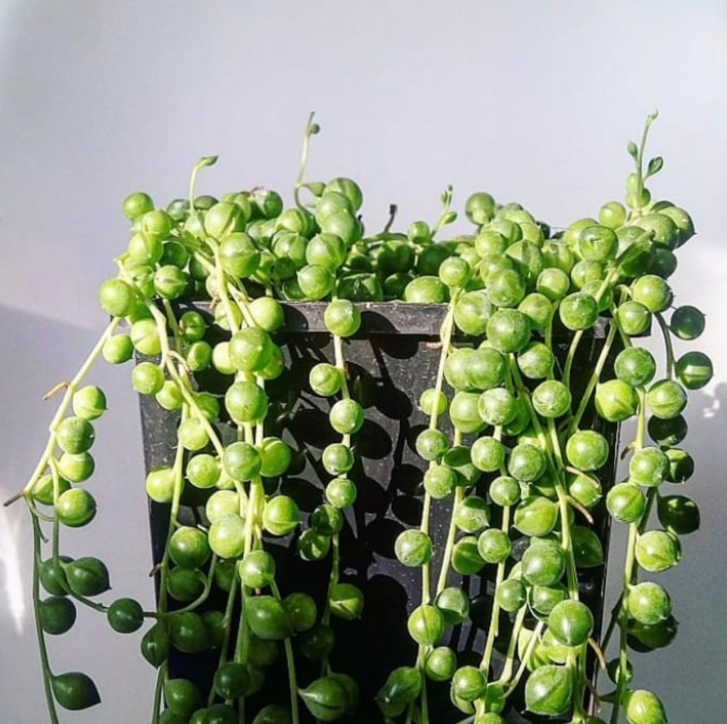 Today’s plant is the biggest culprit of all in that respect; you know, ‘the plant that has lots of bobbles on it‘ ‘the plant that looks like peas!‘ ‘so-and-so bought a fake, sorry ‘faux’ one of these in Marks & Spencer the other day‘…all ways I have had people describe to me Senecio rowleyanus: otherwise known as string of pearls, or string of beads! A brief note on this, in the UK at least, string of beads is more commonly used to refer to the closely related ‘string of bananas’; Senecio herreianus. This has a slightly elongated oval, almost teardrop shape as opposed to these almost perfectly spherical pearls. Last year we recieved these on a delivery instead of a string of pearls by accident and let me just say, they were nowhere near as popular as their rounded relative!