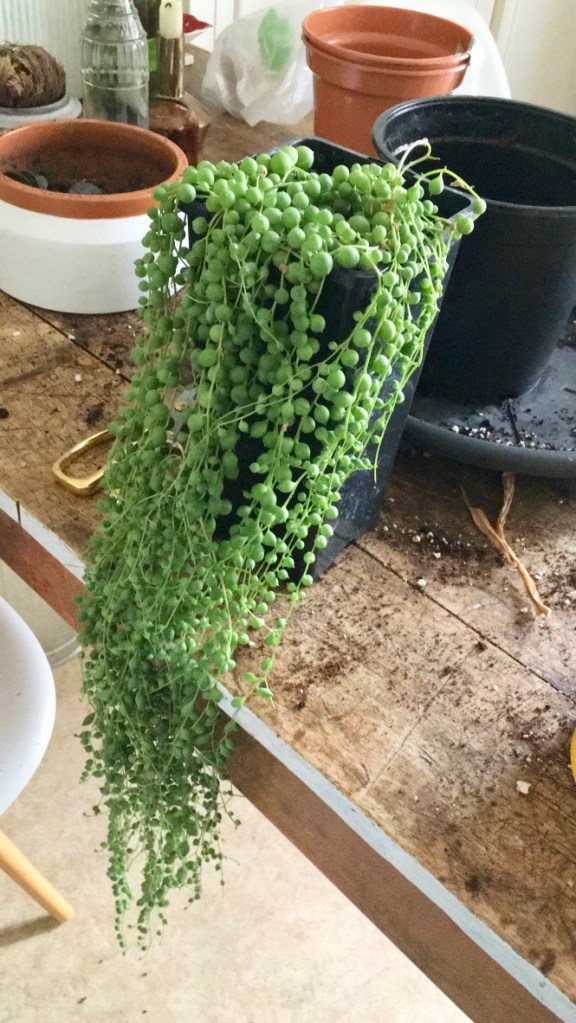 Caring for these string of pearls can feel like quite a learning curve if you are new to houseplants, particularly succulents. As with all plants, the main issues are light and watering… this plant needs lots of the former, and (relatively) little of the latter. The main reason these plants don’t survive is overwatering. I water mine once every 2-3 weeks-ish in the growing season and lightly once a month during winter. I water deep into the pot until water runs out the bottom and during winter I often water on a plate from below.