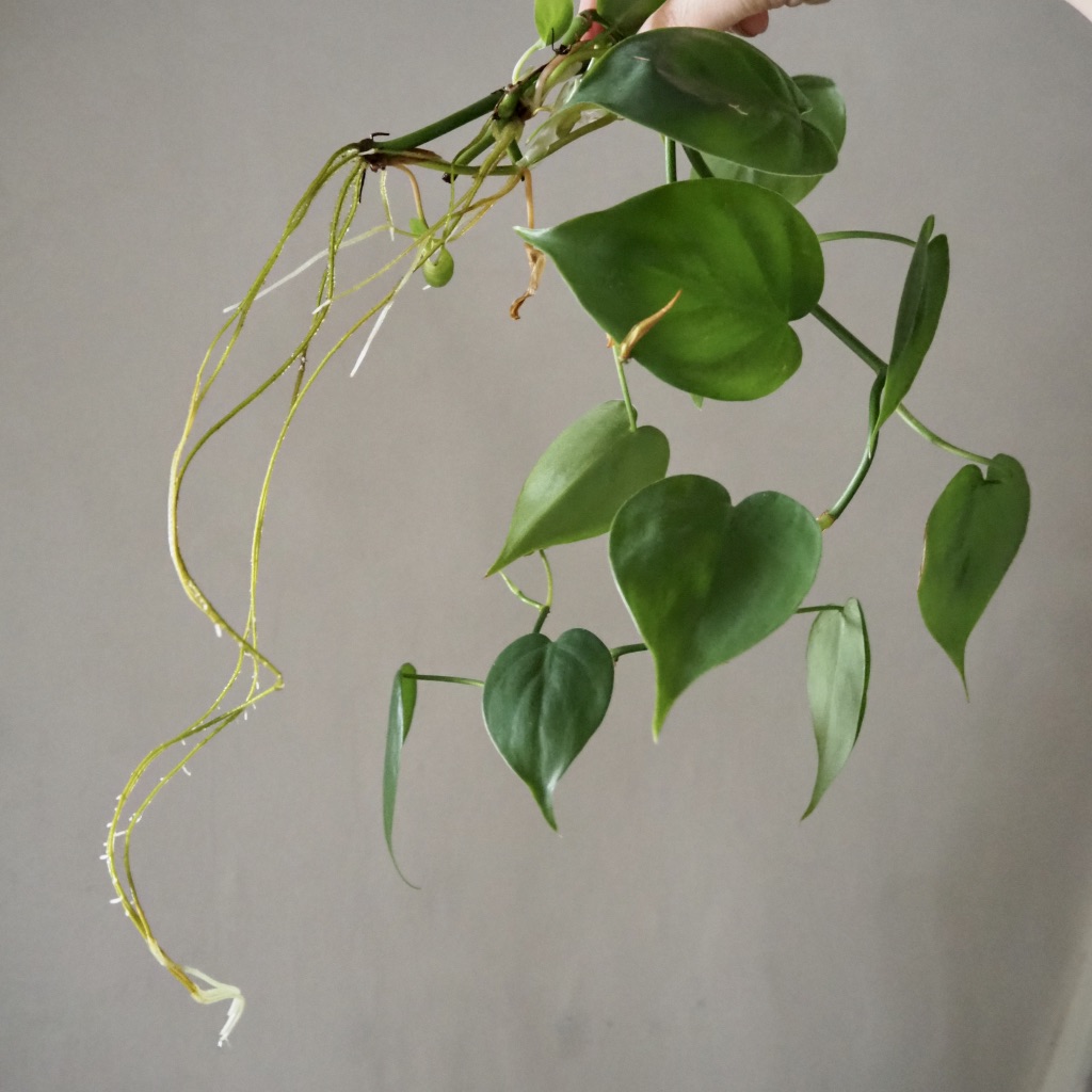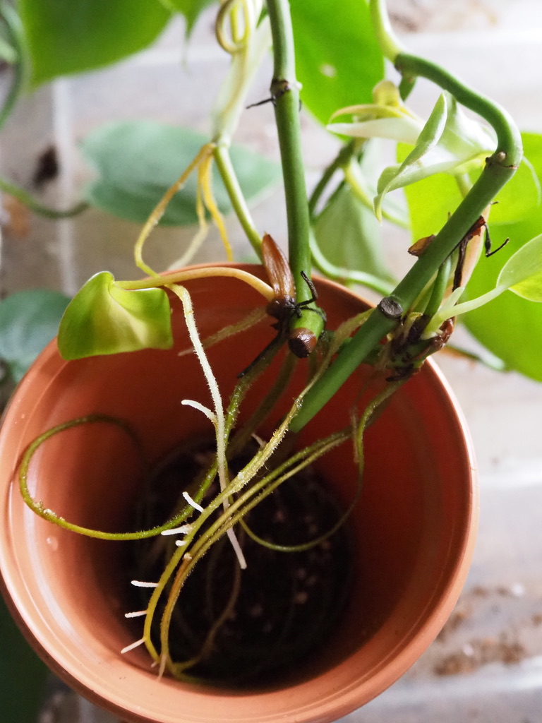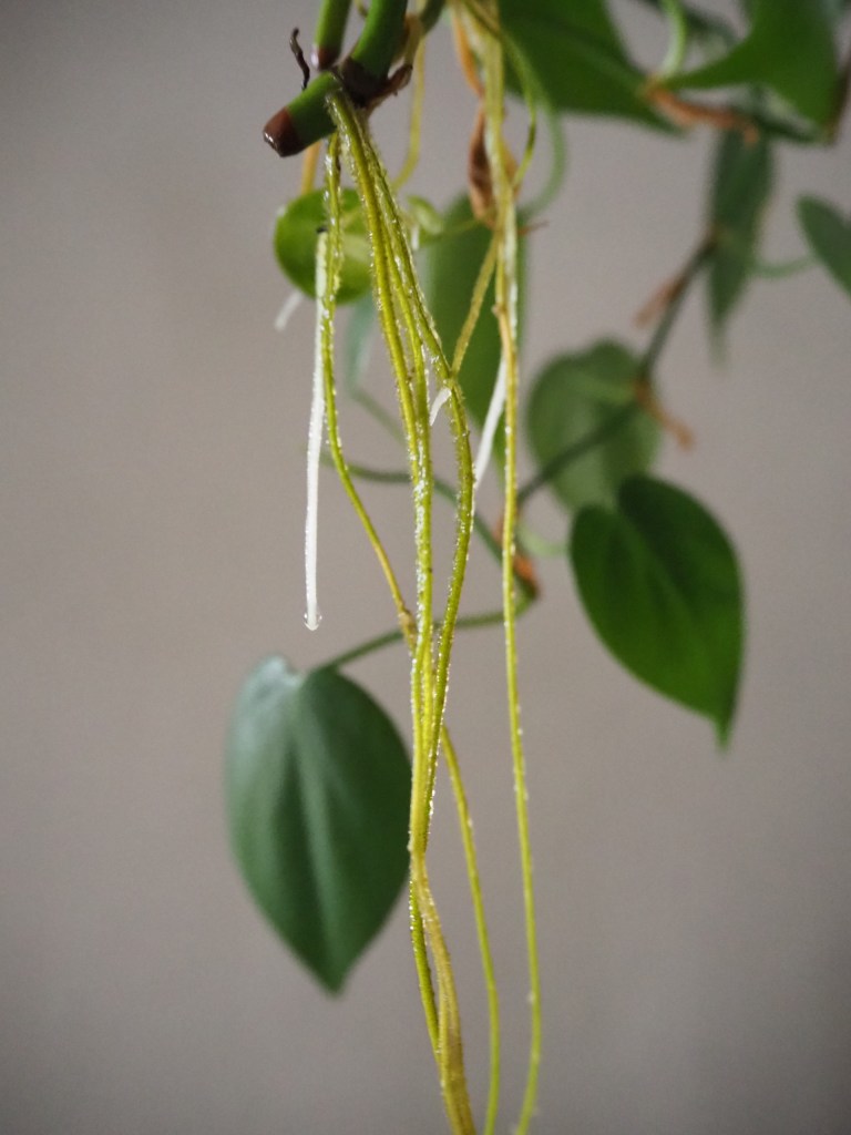 I eventually got around to potting up my Philodendron scandens cuttings that have been in water for absolutely ages! This wasn’t really intentional, I just kind of forgot about them. As you can see from the photos, the roots have got extremely long but I curled them around in a little pot + have now hung the plant off my curtain pole in a hanger.