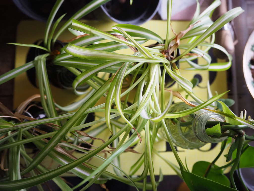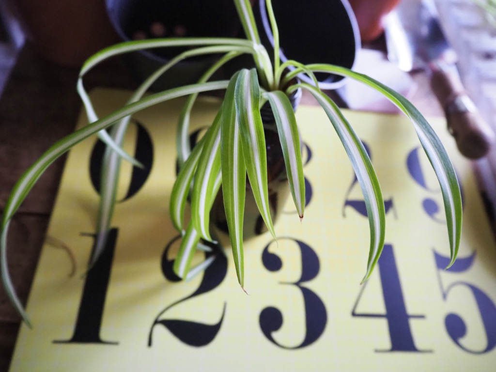 I always have spider plantlets propagating in various jars and bottles, I really think it can bring a space to life. The mother plant is looking slightly bedraggled now + some of the plantlets naturally drop with age, so I have been popping those in water + I decided to pot these 3 plants together (it doesn’t matter that they are at various stages of rooting):