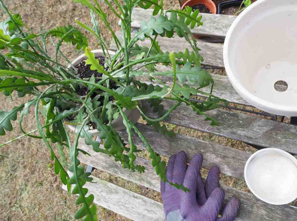 This was a plant I had been avoiding repotting because its just so awkward + spiky! These strap like zig zags have little white hairy spikes which can be sharp, so it was a job that required my gloves. Also called a fishbone cactus, these plants don’t have a big root structure as they are epiphytic (meaning they grow off the surface of other plants in their natural habitat) so I am careful to not jump up in pot sizes with this one.
