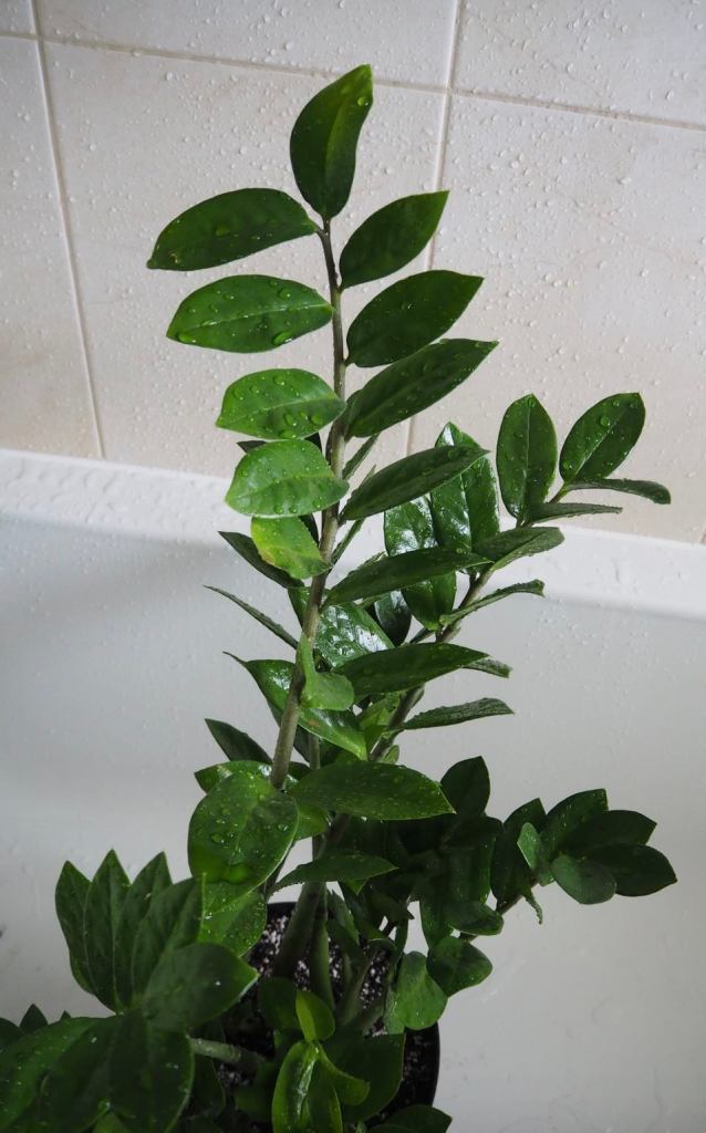 The photo above shows the root ball after loosening — it’s good practice to do this to allow them to settle into their new home well. If they have been contorted by the plant pot, they can sometimes retain this shape even after potting for a long time + just sit in the new pot surrounded by new potting mix… I always encourage the roots by tousling them with my fingers gently. Here is is after repotting — I like to shower my ZZ every few weeks to keep those leaves lovely + glossy: