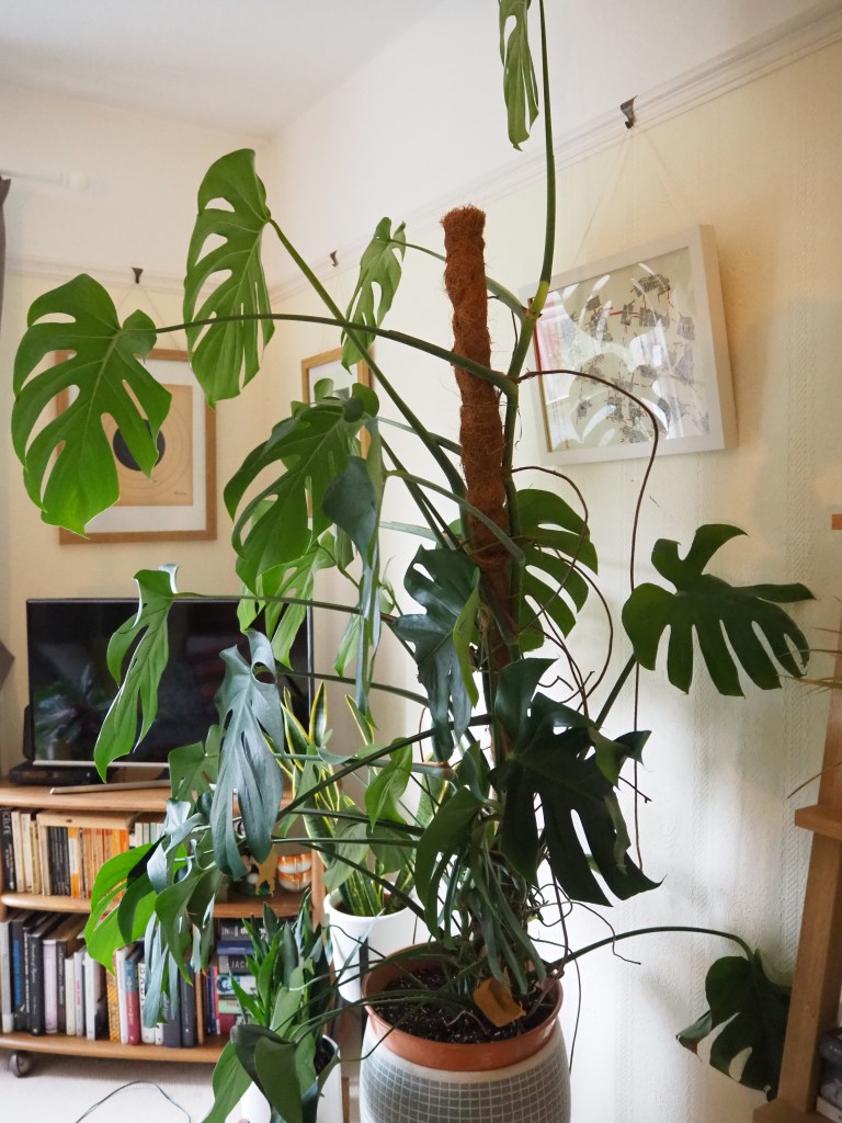 The photos of my big monstera from the side show how the support sits just off centre of the middle of the planter + the plant ‘leans up’ against it. I trained my plant from quite a small specimen so it has really started to grow around the coir pole, which makes it less visible from the front. Bear in mind the shape of your monstera will affect how your plant looks if you introduce a support, but they do adjust. I have three monstera plants + I’d say this is the best looking in terms of the way the support is quite obscured by the leaves. This was intentional as my plant is against a wall + over the last few years, the leaves have all turned to face the window. If your plant is central in a room you’ll want to pick the type of support that suits your plant being visible from all sides. I’d suggest 2 U shaped canes crossed over like an X (each cane at 90 degrees to the other, crossing over at the centre of the bend) in this instance.