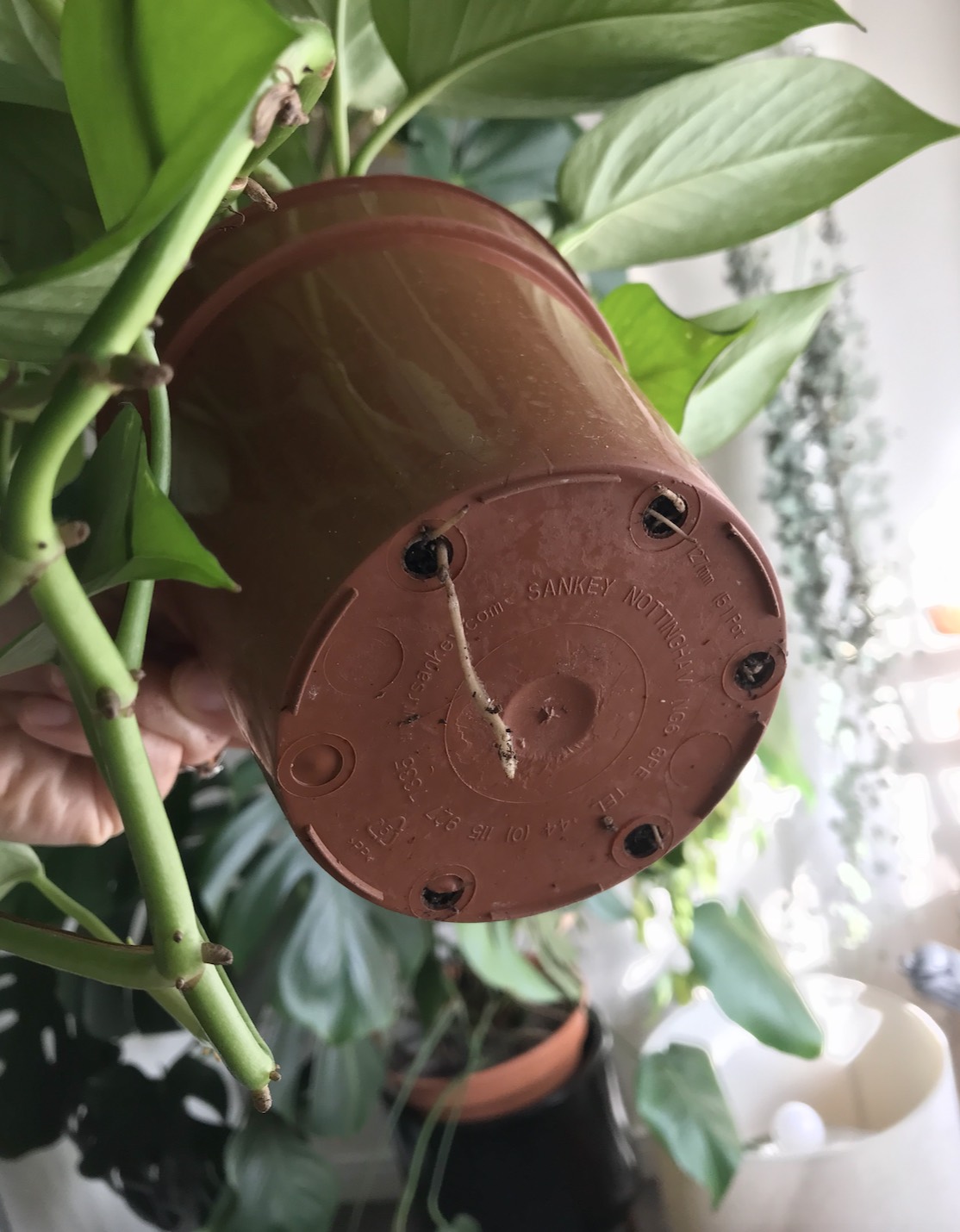 Compared to my other golden pothos, this plant is the furthest away (around 4 metres) from my south-east facing window + it still grows well — a testament to it’s easy-going nature. As with all plants, less light does equal slower growth but I haven’t had any small new leaves which can sometimes happen when light levels are diminished. As a result, this one hadn’t been repotted for a long time either + it had one weird root growing out of of the drainage hole so I thought it was about time to give it some TLC. I only went up one pot size as I prefer to keep my pothos quite snug in their pots which is something I’d advise — I just find they grow better this way! I use my houseplant potting mix for my pothos — a mix for houseplant compost, chunky orchid bark, perlite + horticultural grit.