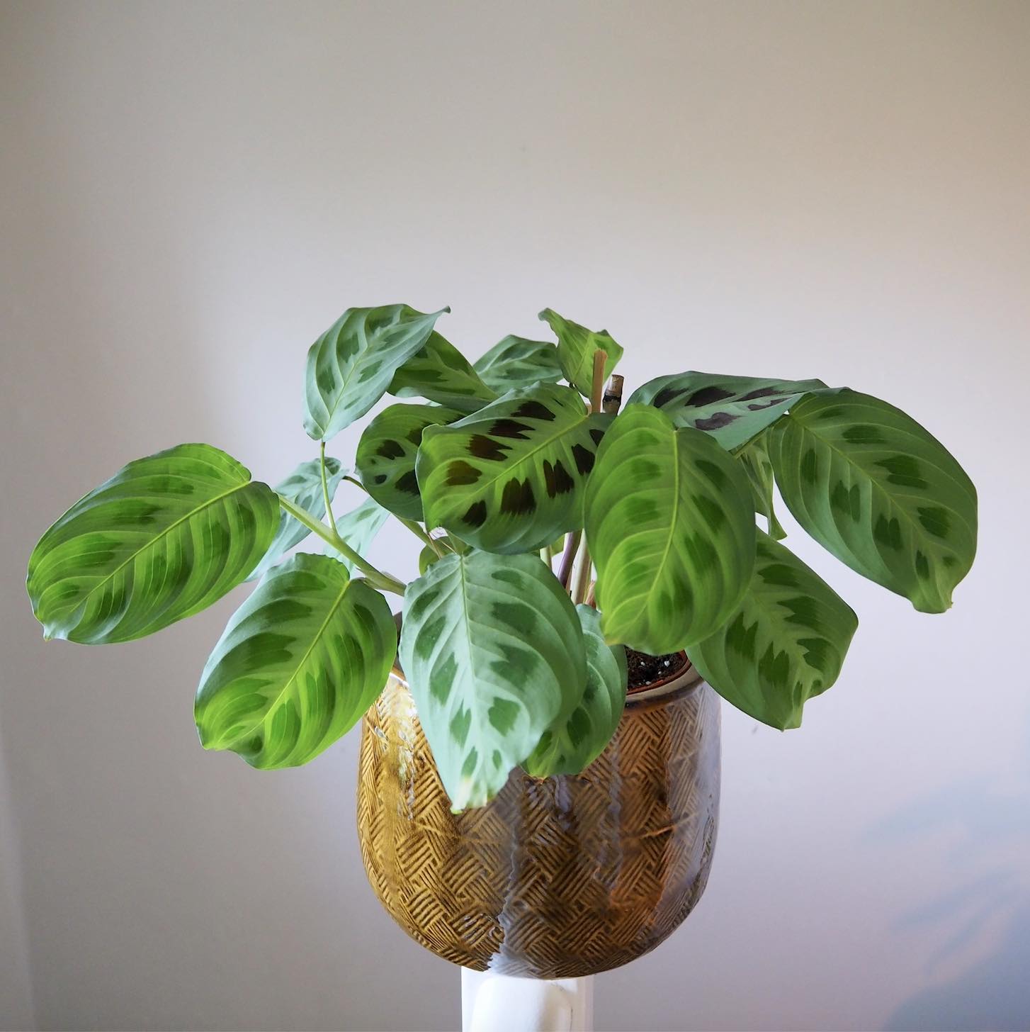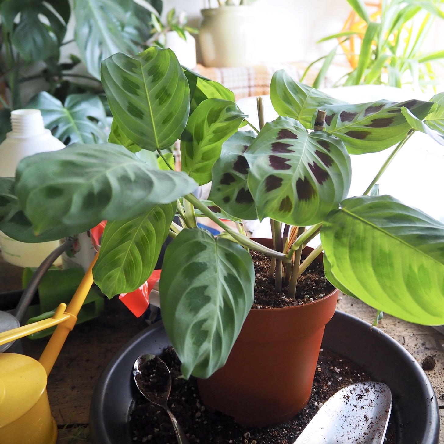 I’ll admit my Maranta has been a little unloved this year, but I am so appreciative of it’s easy going nature + how it has coped with occasional neglect that I felt it deserved to be part of this post. In my last apartment, it moved around a bit + I never really found a good position for it. Here, I placed it on top of my fridge soon after moving in + was amazed to see how well it’s grown. It’s a rather unglamorous position which does mean I probably photograph it less than my other houseplants + it occasionally gets caught in the door too. It’s about 1 metre away from a draughty north-west kitchen window + it also gets blasted with cold air from the door nearby, especially this time of year — there are some crispy brown tips but nothing major. I repotted it over the Summer + it has really blossomed into a beautiful plant as the photos below show: