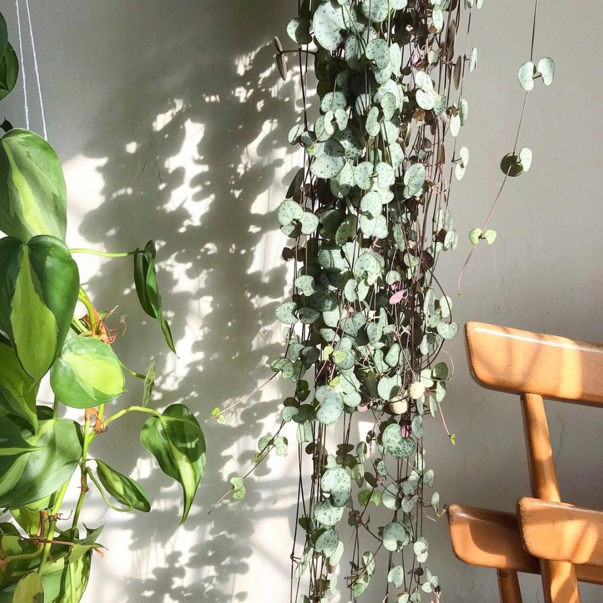 Alongside my string of hearts hangs my Hoya linearis + oh how it has been loving life since moving in February! It is positioned close to my south-east window (0.2-0.5 metres) but is in the corner so is protected from any really bright light a bit more than my SOH. An hour of two of late afternoon sun has encouraged lots of growth + it’s starting to rival my ceropegia in length. In my previous apartment, I had it around 2 metres from a dual aspect room which got south + west light, which also suited it well. I have a complete hoya care guide if you want to read more on how to care for these trailing beauties… I’ll link it here.