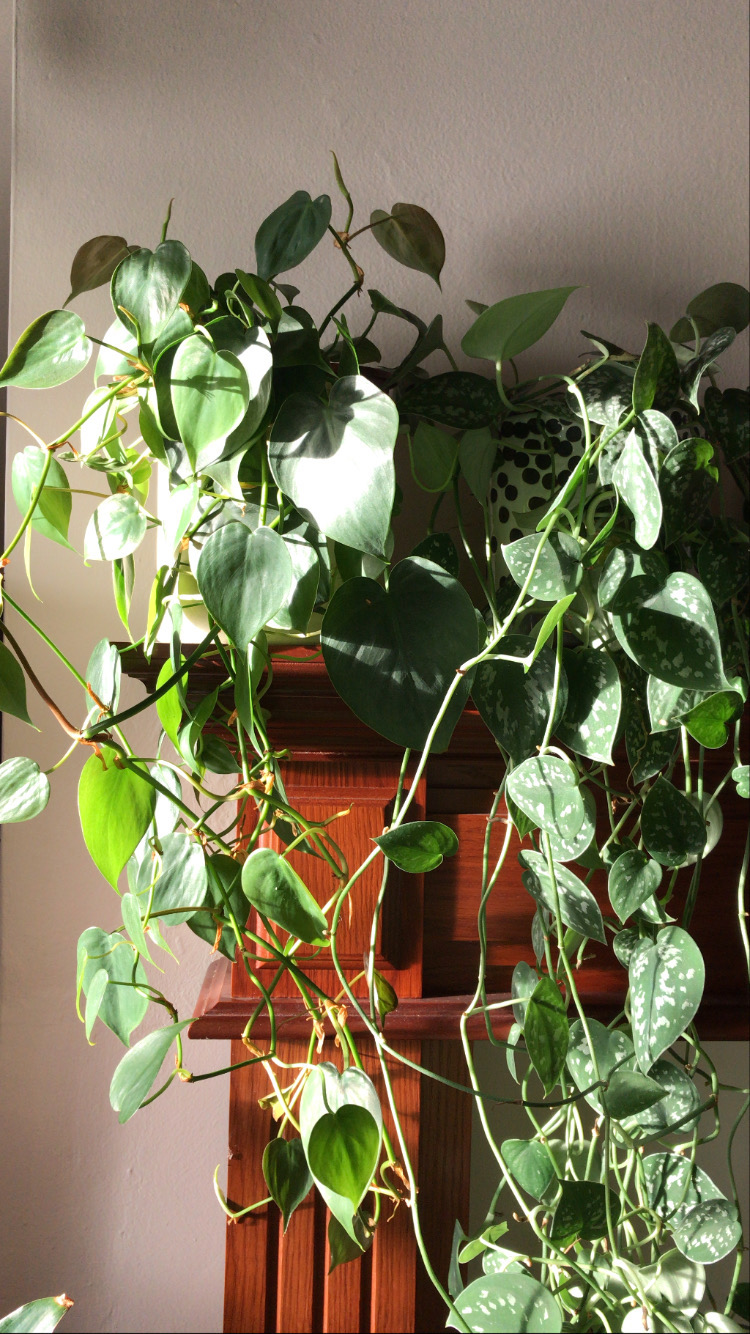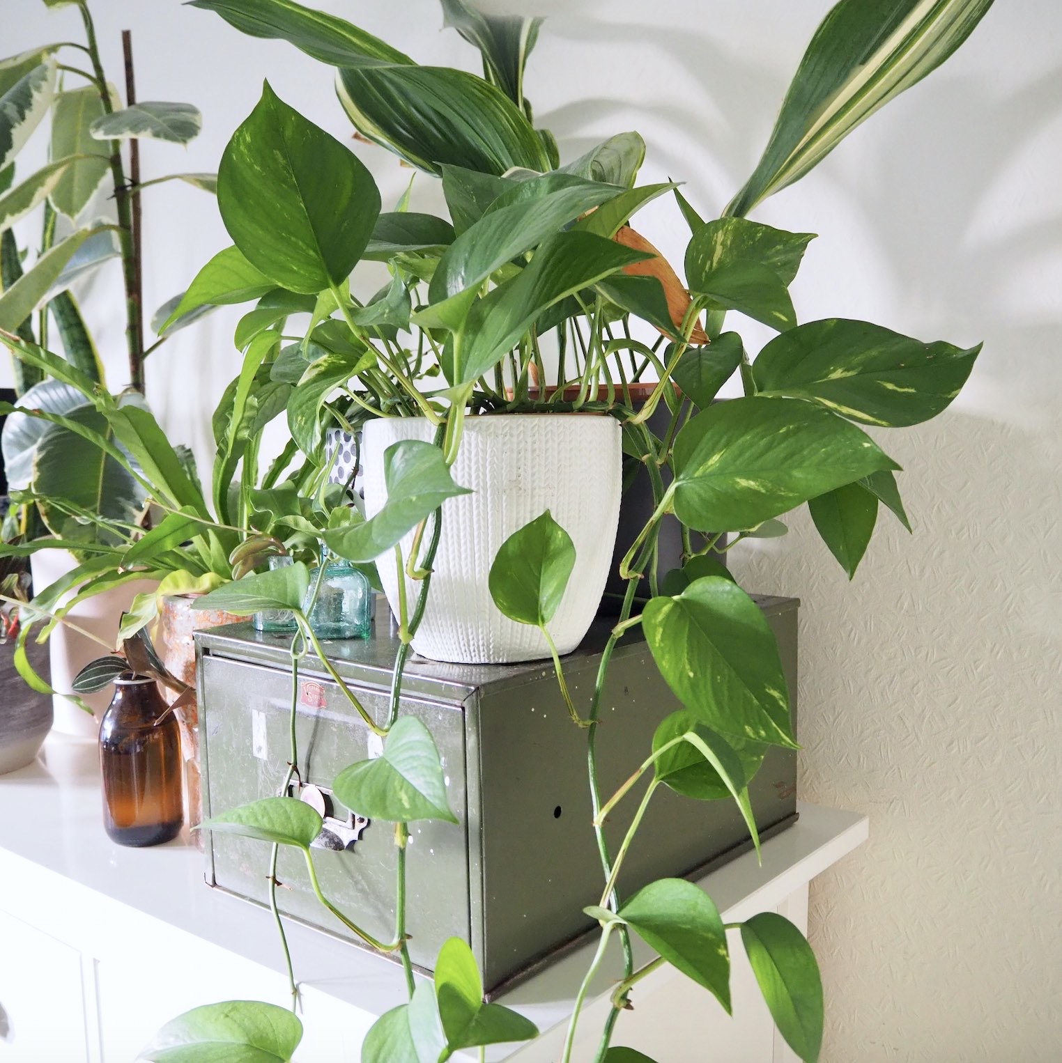 Ah, the humble pothos plant is such a staple in a houseplant collection — low fuss, adaptable, easy going, jungle-looking… I wouldn’t be without one (or a few)! Epipremnum plants have a classic trailing look that, if given the correct care (there’s a post on that here), can really get out of hand! They make a great candidate for tumbling down bookshelves, trailing around window frames, even trained across ceilings using command hooks if that’s your style. But when they outgrow their space they are also easy to propagate too. One of my oldest pothos plants is my Epipremnum aureum ‘marble queen’ with it’s wonderfully creamy variegation that makes me think of vanilla ice cream. Due to the low ceilings in the cottage I’m currently in, it’s not been living it’s best life for the last 10 months as it’s messily trailed around a drawer unit + has not had room to stretch out at all. I think I will take some cuttings of this plant + get propagating them to make up a little planter that I can put on my desk as I’ve not been able to appreciate the foliage as much as I would like. My golden pothos is hitting the floor in my bedroom so that could also do with a trim to keep it neat.