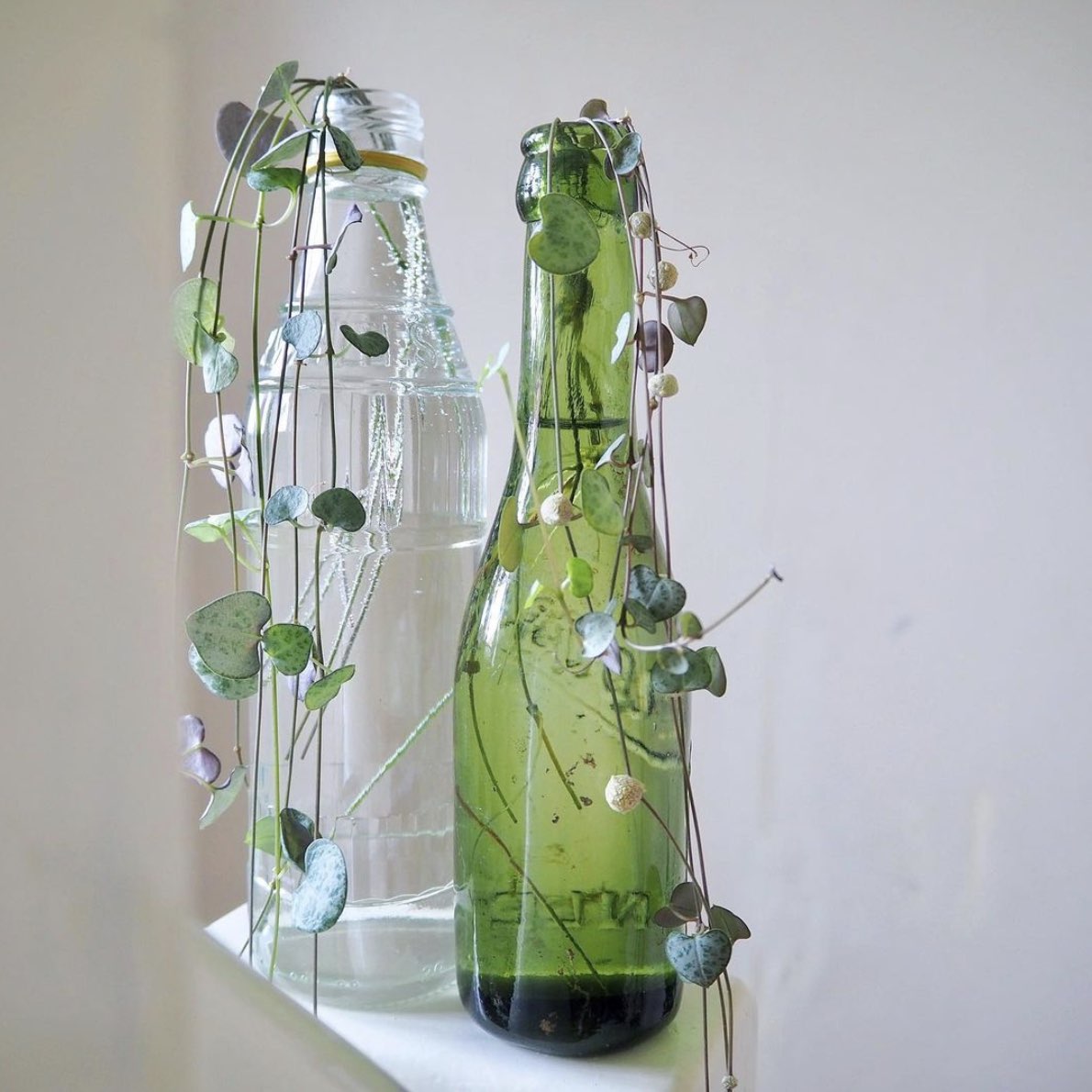 My string of hearts has really flourished this year + I don’t mind to take cuttings when things start to look too unkempt as I love how a simple pot of this plant looks against a white wall. As I write this post, my mature Ceropegia plant is currently draping precariously over a set of drawers and I am slightly worried it will get caught in one if I shut it quickly. So time to get the snips out + get rooting some more. I got quite a few questions about how to propagate string of hearts plants, which I have detailed in a SOH care guide, which I’ll link here if you want to read more. As you can see in the photo below, I generally water prop mine, which can take a few weeks, but the cuttings look so lovely trailing out of a vintage bottle, I don’t mind being patient!