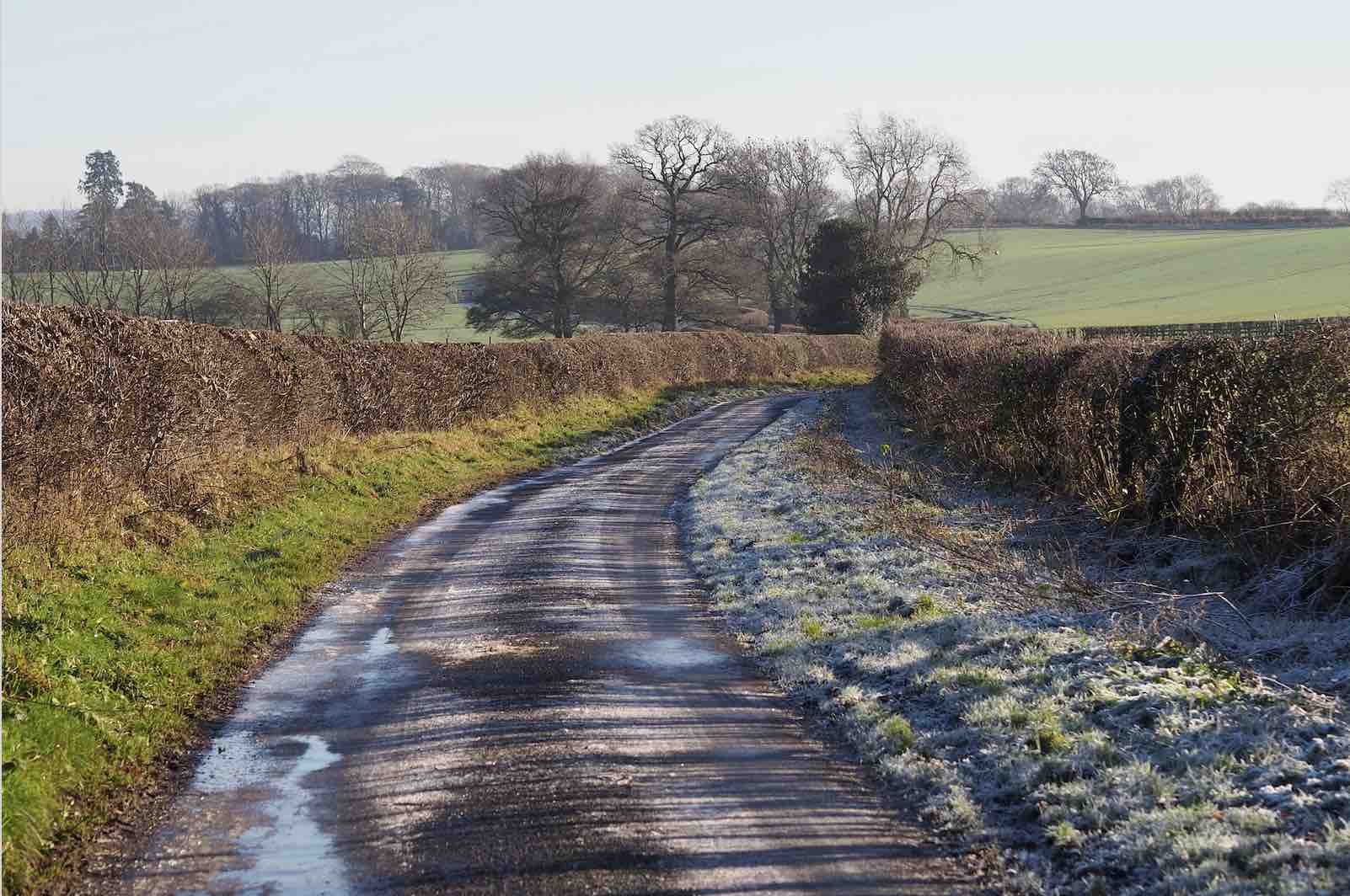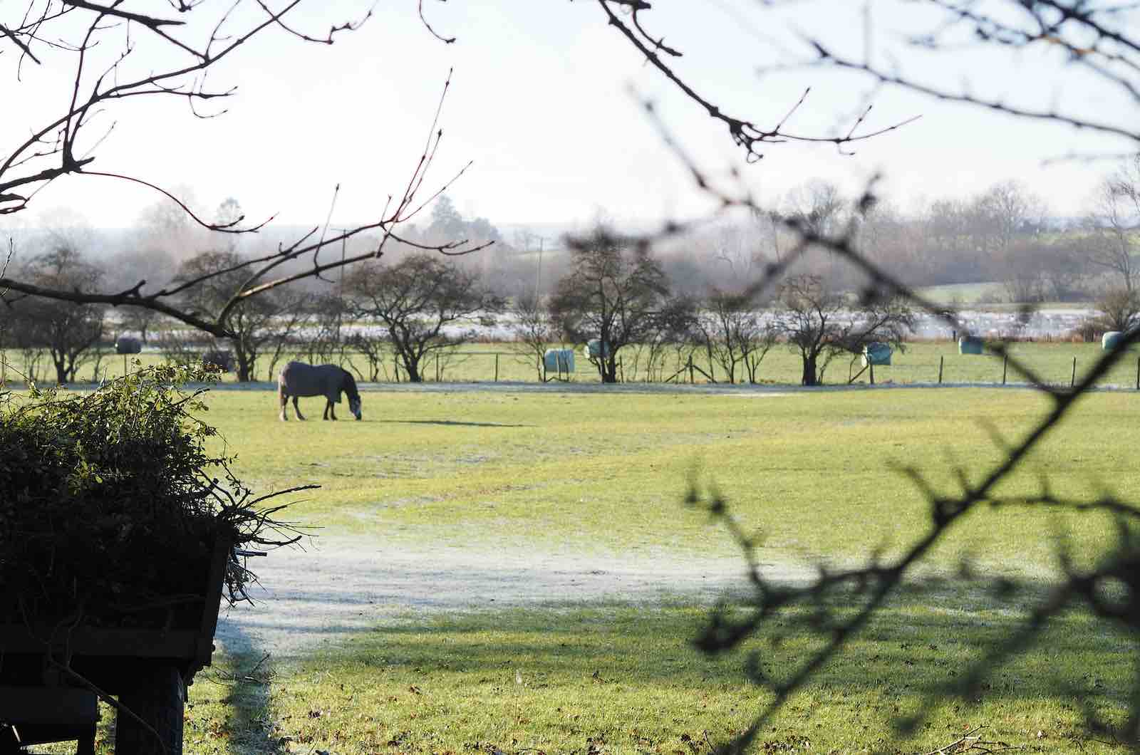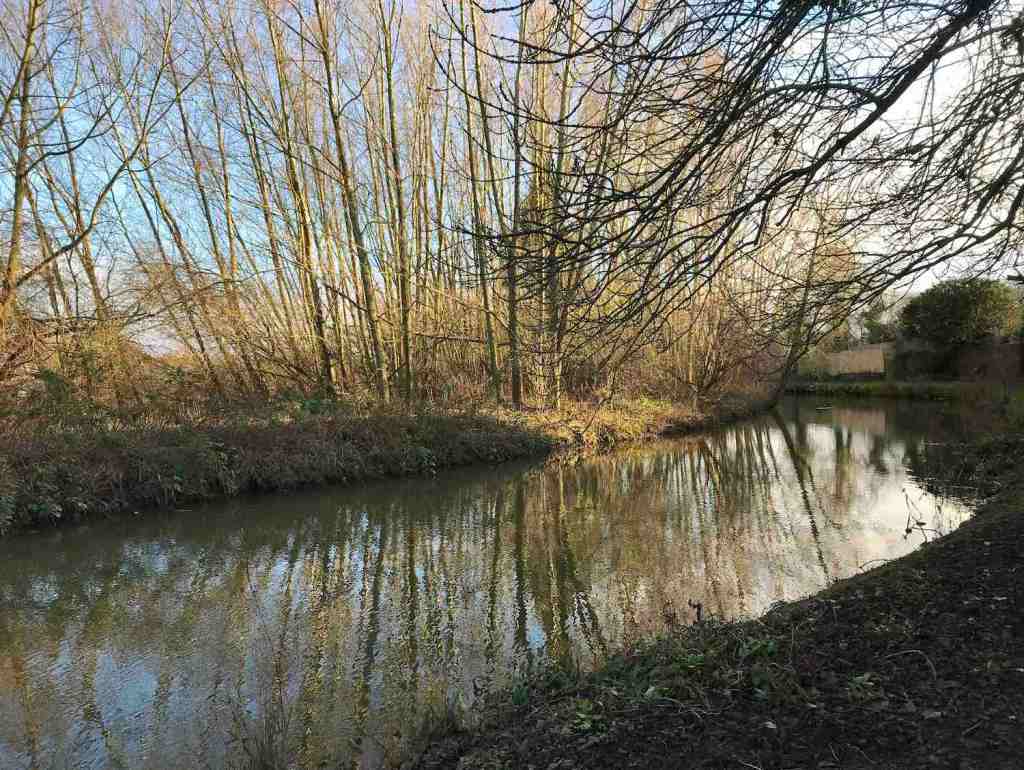 Still more snow flurries this month but lots of clear + bright days too —the kind of sunlight that calls for the enjoyable coupling of sunglasses + beret. The fields look entirely different when covered by a blanket of white, but it doesn’t last longer than a day or two before it dissipates. Muddy boots on the back doorstep. Went to buy bread + stumbled upon a river that I had not seen before; the little building at the riverside is an 18th Century Leech House. The reflections in the water of bare trees lining the riverbank create a mesmerising illusion. In the house I’ve been moving the plants around a lot to cope with the draughty windows + the glow of grow lights has become a standard occurrence in the afternoons. Puddles on countryside lanes still solid with a thick icy layer. As January draws to a close, the low sun casts long shadows across the road + trees loom as statuesque silhouettes against a blank blue sky.