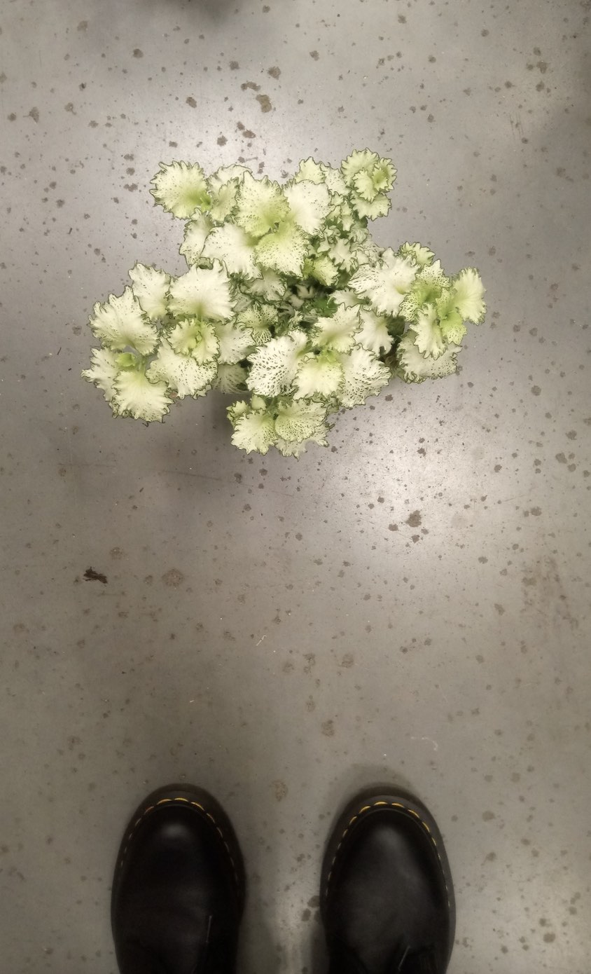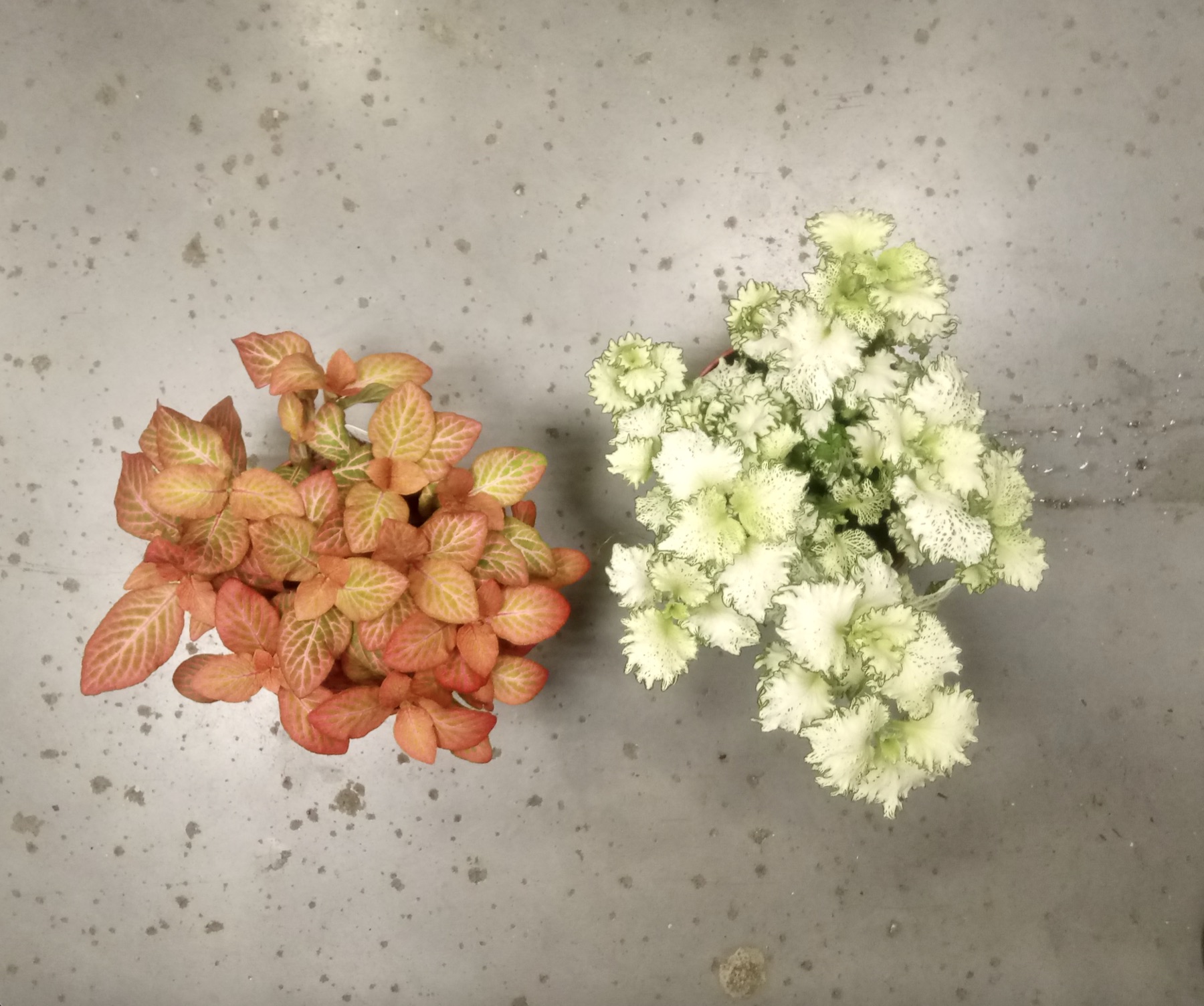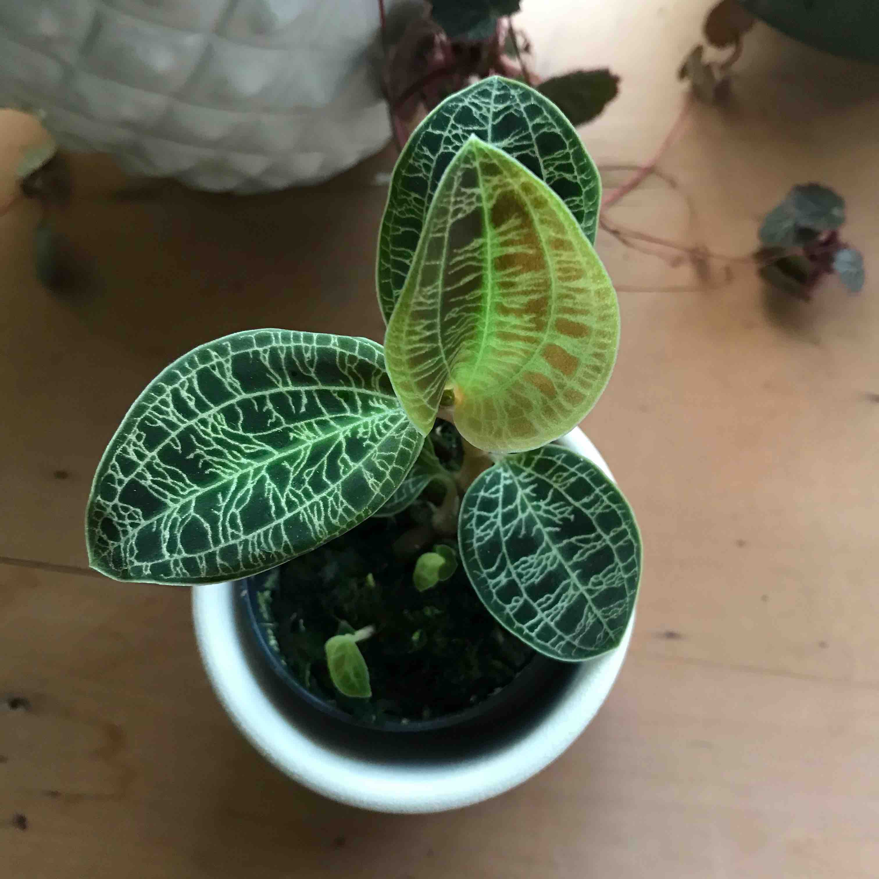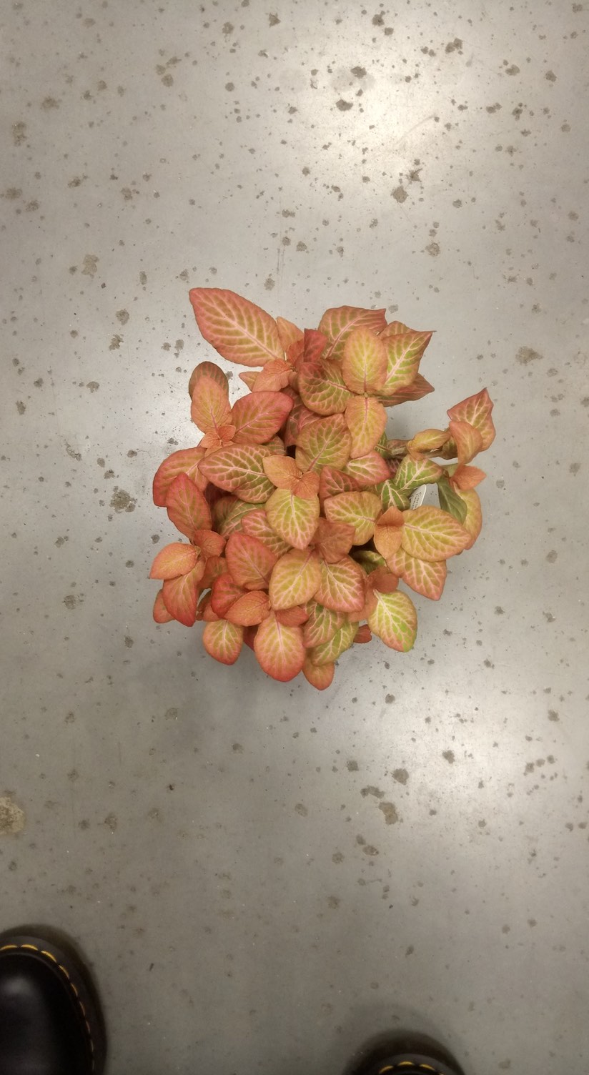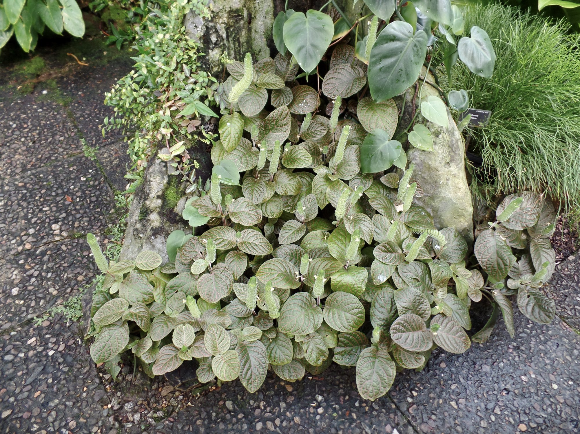 With their paper-like foliage, Fittonia are not keen on a very bright position — their leaves will get easily scorched + yellowed if the plant is getting a light that is too intense. In their natural habitat of South America, they are a low-growing creeper + so are more amenable to indirect light conditions as a houseplant too. There are many cultivars in all shapes, sizes + colours, here are two growing in Botanic gardens: to the left is a photo I took in the Royal Botanic Garden Edinburgh which illustrates its growth habit well + to the right is a Fittonia gigantea, a large leaved cultivar I spotted in the Chelsea Physic Garden, with my hand for scale: