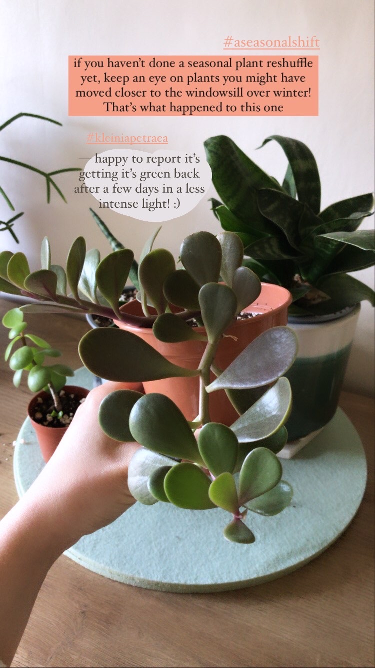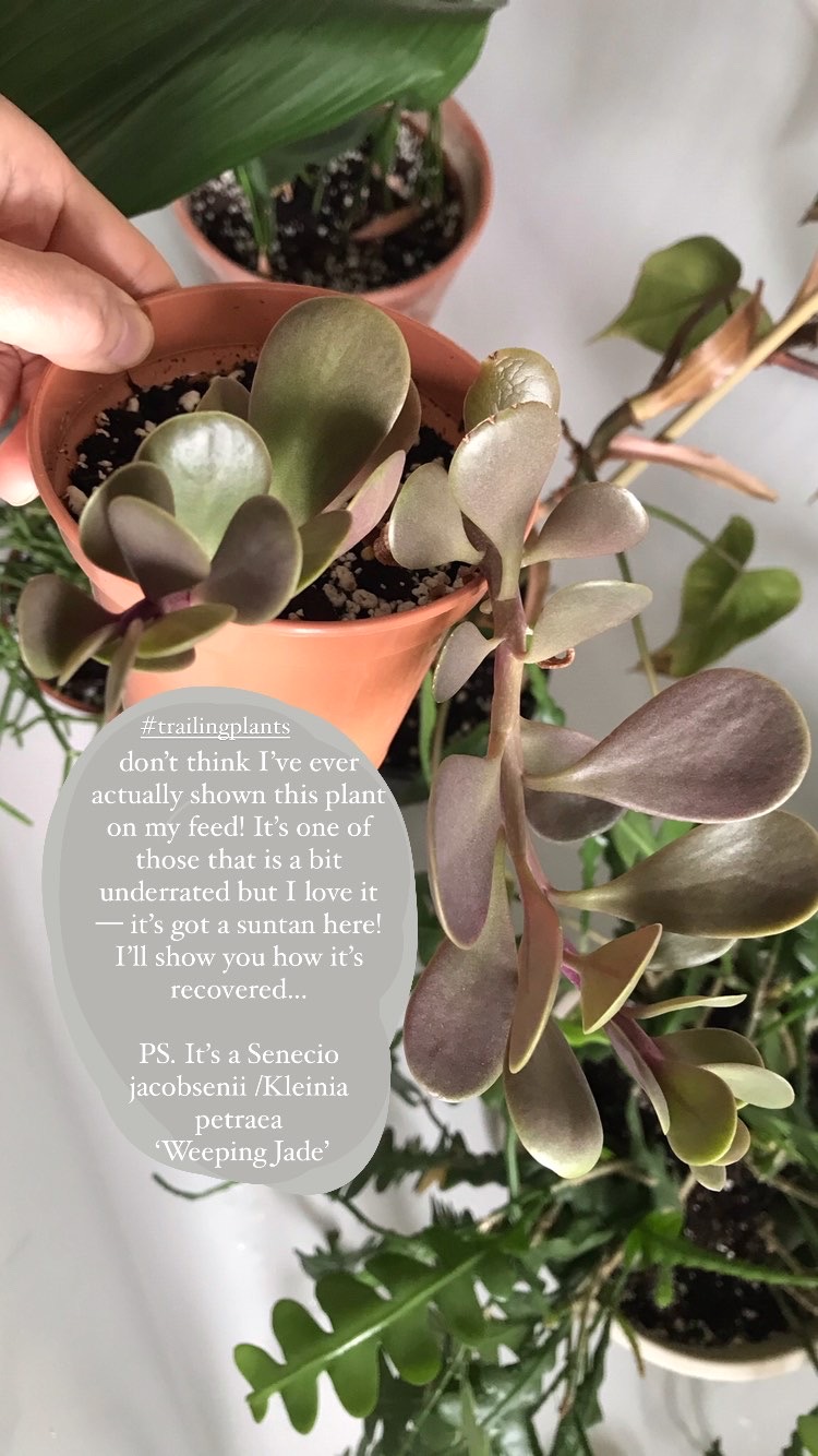 This is a plant that I rarely see online + one that I love to grow. I propagated this trailing jade as a cutting a few years ago + it’s only really started to trail over the last year. It has been loving life on the south east windowsill but I forgot to move it back a bit in recent weeks (a classic mistake as the seasons change) + as you can see, it has developed a bit of a suntan! It will revert back to green after a few weeks (see photo below from my IG stories after a few days), but this is a warning to anyone that hasn’t looked at their windowsill plants now that Spring is here + the light in increasing in intensity! This was a plant that I checked + it didn’t need repotting quite yet, so I just popped it back in + gave it a clean + tidy up. Sometimes it’s good to have a quick look at the roots to see how your plant is doing but I don’t re-pot for the sake of it…. there are plenty of other plants that need it right now!