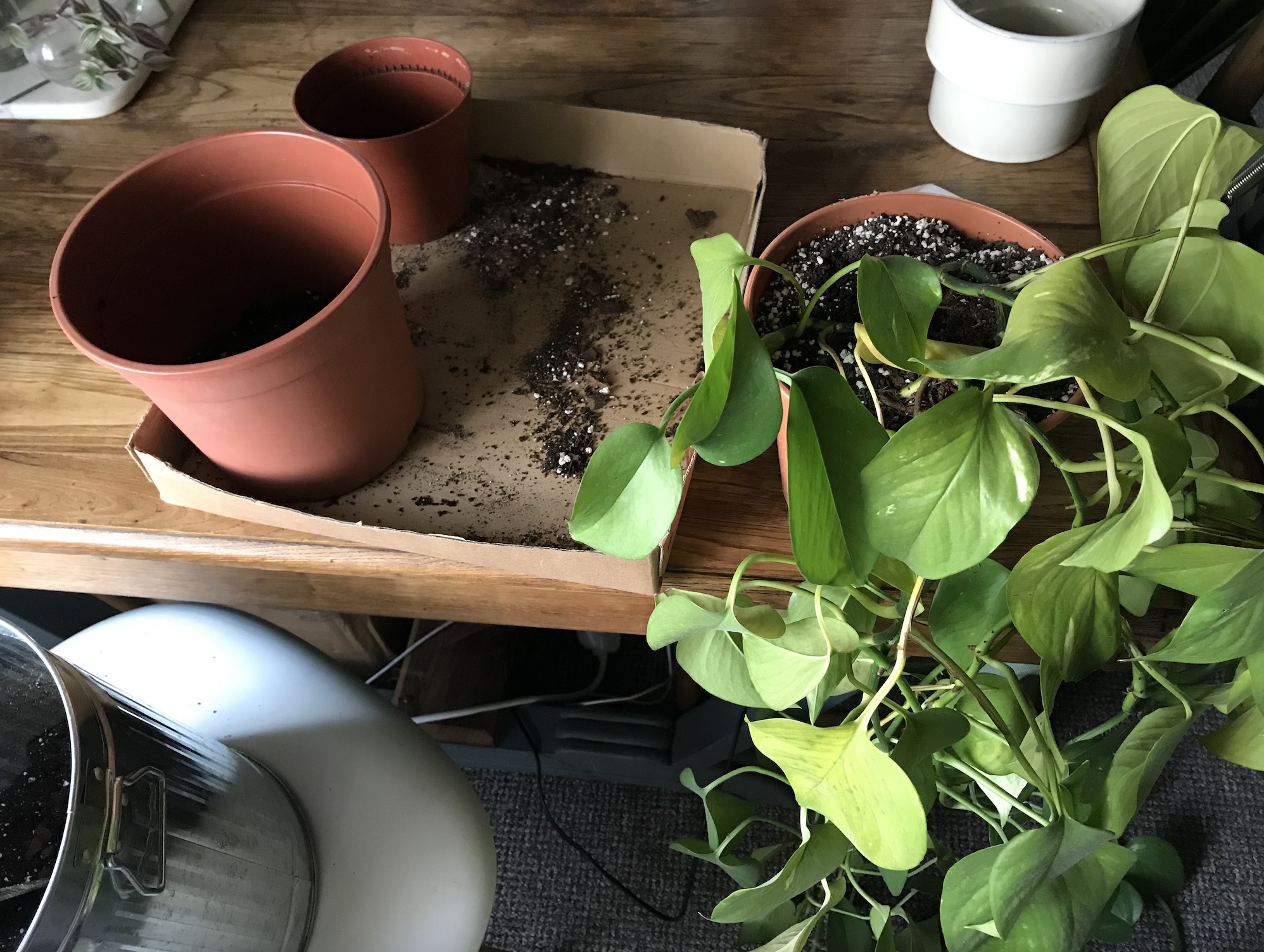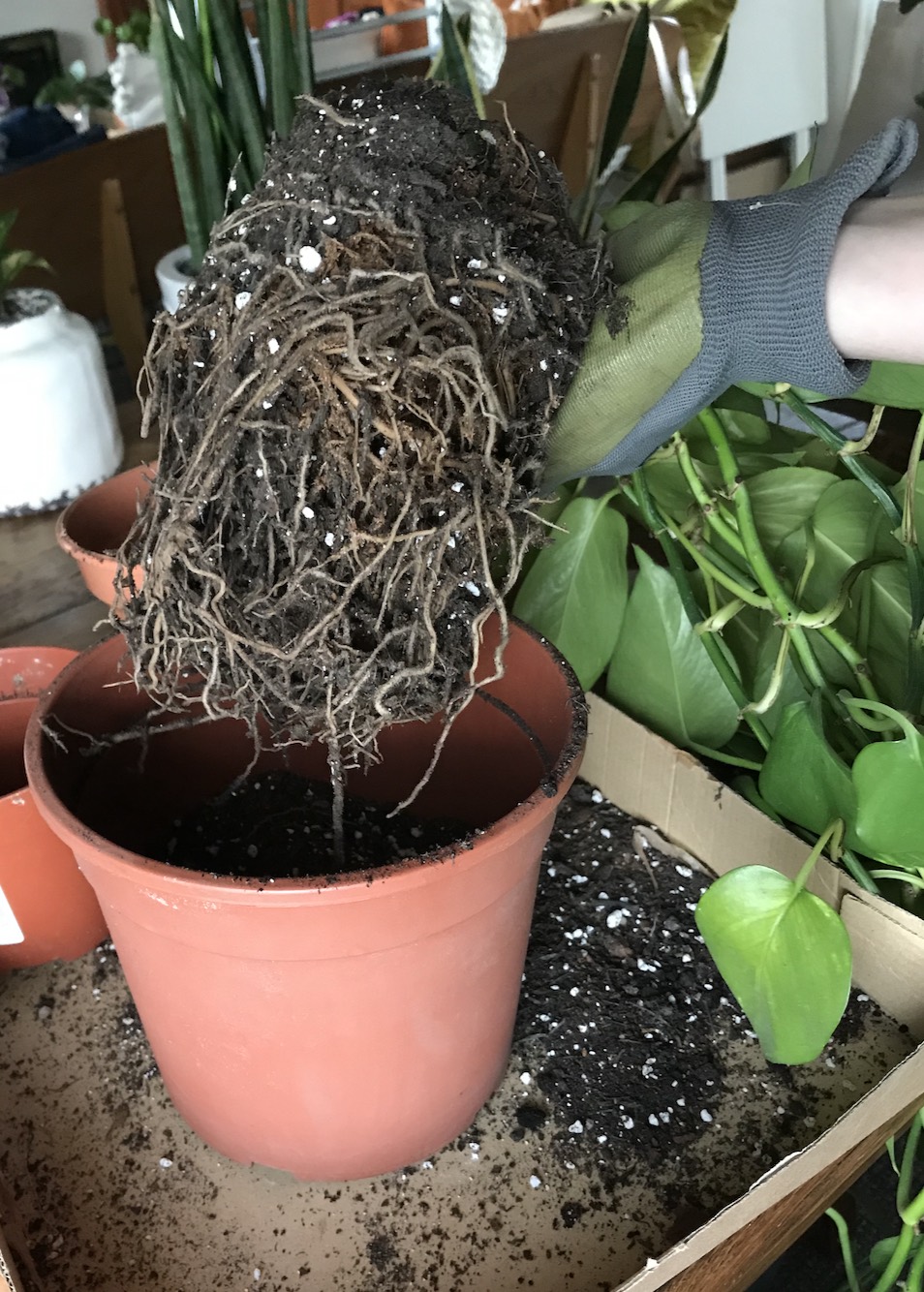 Welcome back! Today’s post is the first Repotting Diaries of the growing season + of 2021 too. Repotting is an aspect of plant care I find really therapeutic + a process I sorely miss over the Winter months. During the colder part of the year I rarely carry out any repotting (unless there’s an emergency) but from early February, I start to make a list of my plants that could really do with some repotting — whether that’s a soil change, a bigger pot, or a spot of propagation by division or taking cuttings. In addition, I begin to collect together the multitude of glass bottles + propagation vessels dotted around HPH that have been patiently propagating for the last few weeks/months. Propagation is generally slower in winter, but I always have a few things rooting around the place!