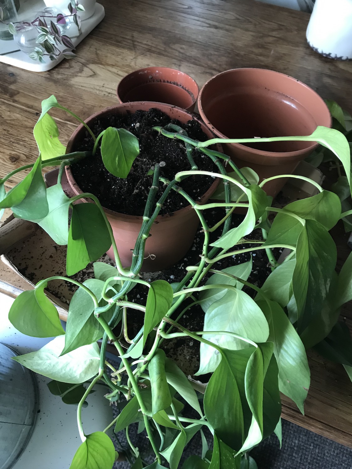 For these stems, I decided to pot them in two smaller pots initially + when they have adjusted to potting mix, I think I’ll group a few of my smaller plants together to make a larger plant again. I find them more manageable as smaller pots initially because they can fit on my potting bench near my south-east window sill, nestled amongst my other houseplants. I’d like to create a hanging plant this Summer so that’s the aim with these I think.