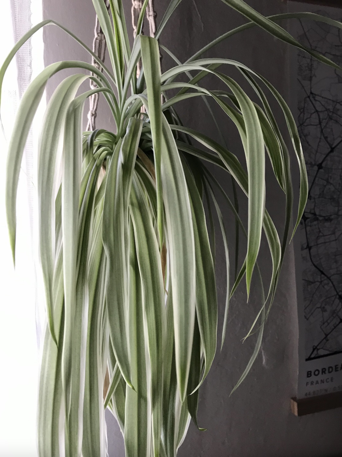 These are resilient houseplants + this one has just started throwing out some plantlets on runners, which I decided to keep intact — I always love how these plants look with baby plants cascading underneath! If you have a little plant, this can take a few years, though keeping it pot-bound can help to encourage them. So I went up a little larger with a planter + found a new hanger to use to hang it on the curtain pole as it seems really happy here!