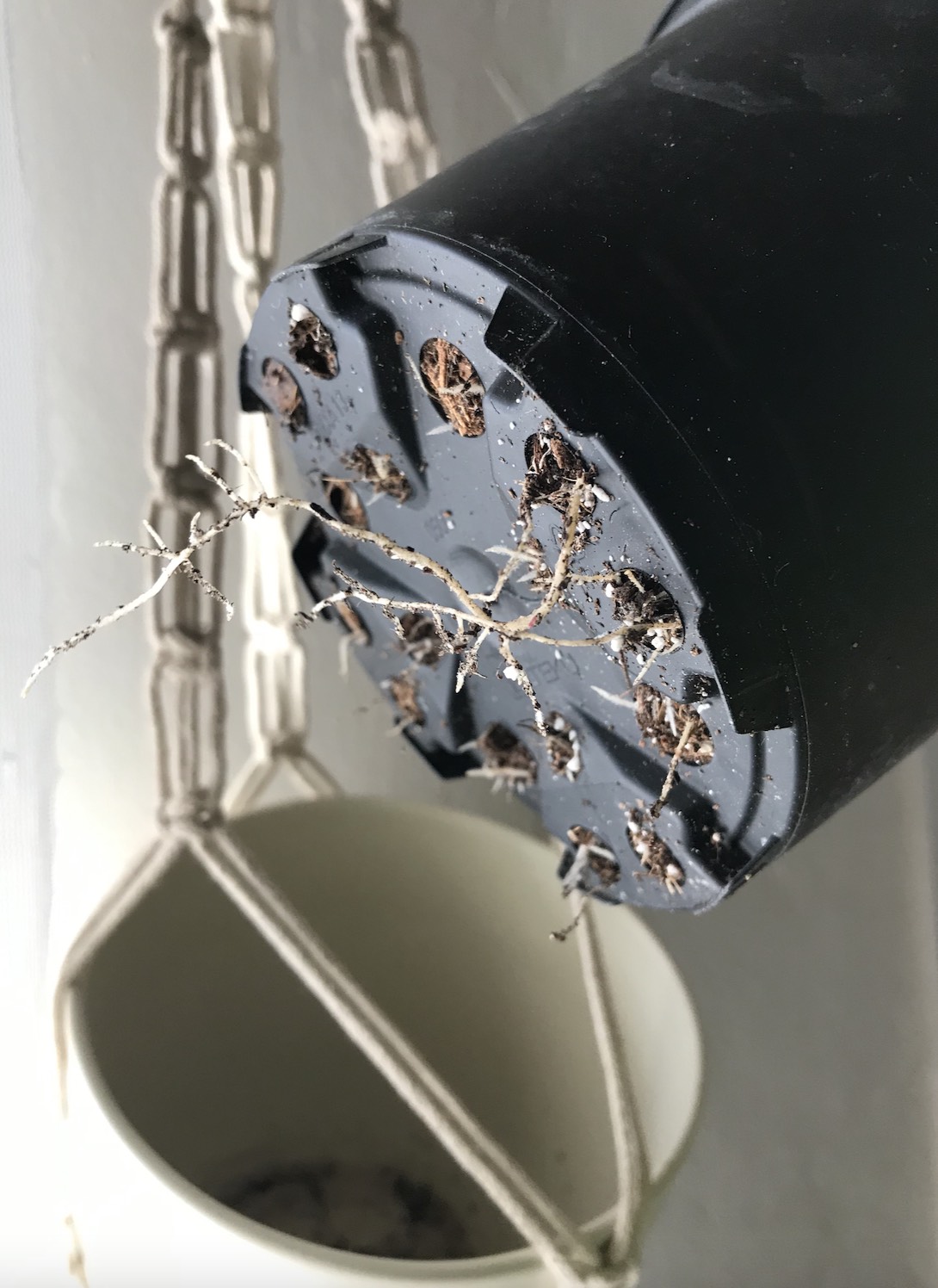 This poor plant has tolerated all sorts this winter + was in great need of some attention, so was one of the first plants on my repotting list! Before I even looked at the roots, I noticed my plant was getting thirsty more frequently, which is often a sign that repotting might be needed. As you can see below, those roots were definitely wanting some more space to grow! I lifted the plant out of the pot + slowly worked at loosening the root ball + shook off any old potting mix. I also checked for any dried roots + pruned those. I found a planter that was slightly larger + less tapered at the base as a temporary planter, but ideally I will give it something a little larger in a few months. For now, I needed to pop it back in the same plant hanger in my bedroom — the low ceilings here make it hard to position my larger hanging plants!