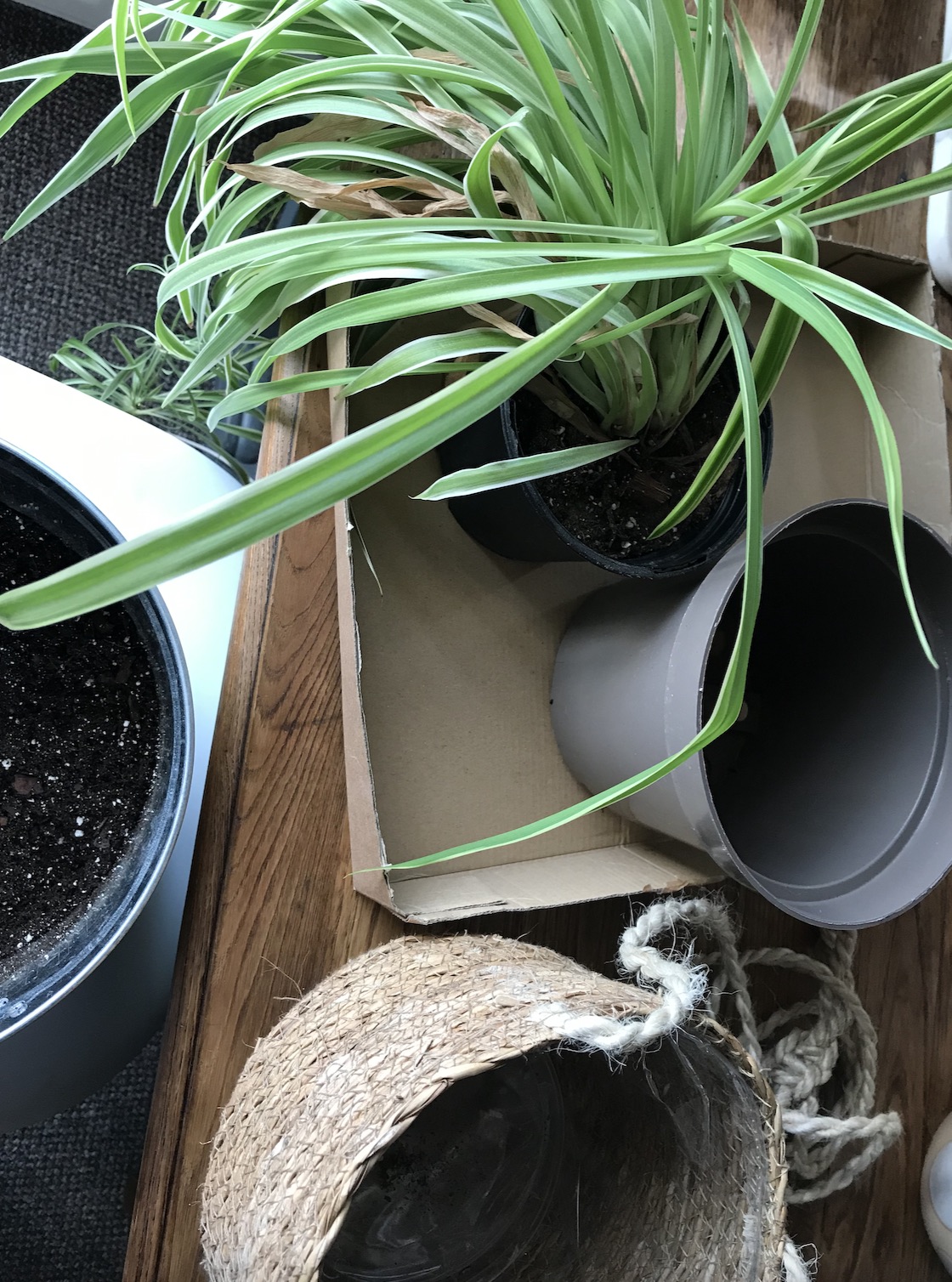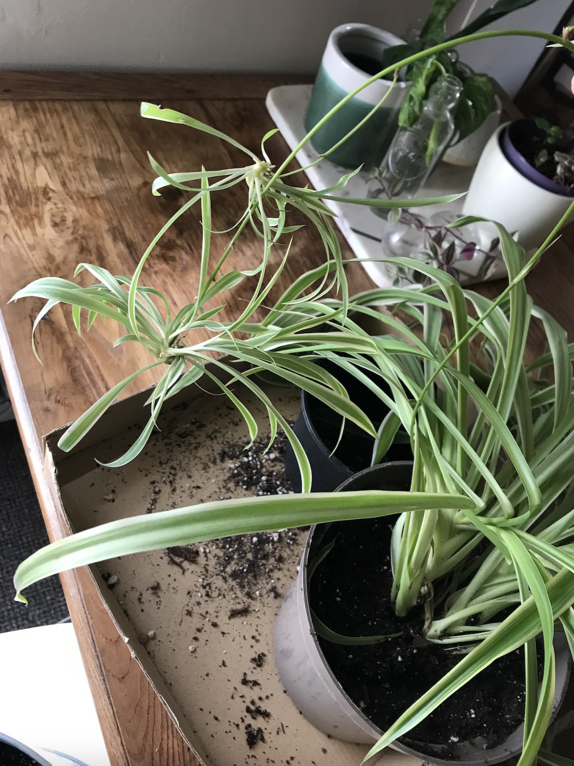 This Spider plant started off with me as a 5cm pot around 4 years ago + it might not be the most popular type of houseplant, but to me it’s a classic! This cultivar, the ‘variegatum’ (with creamy edges + darker green leaves) is less common here in my area that the more typical chlorophytum comosum ‘vittatum’ (green leaves with a broad cream central stripe) + I also have a plain green ‘lemon’ variety too. My spider plant here has settled in quite well in the cottage but over a few weeks I noticed it was looking positively grey (below left)! This was a surefire sign that my plant needed repotting (it can also signal it’s dried out) as when I looked in the pot, the roots had grown out of the drainage holes. If you are new to houseplants + haven’t experienced this before, it might look quite alarming! But the photo below right shows it 48 hours later — back to its usual shade of green.