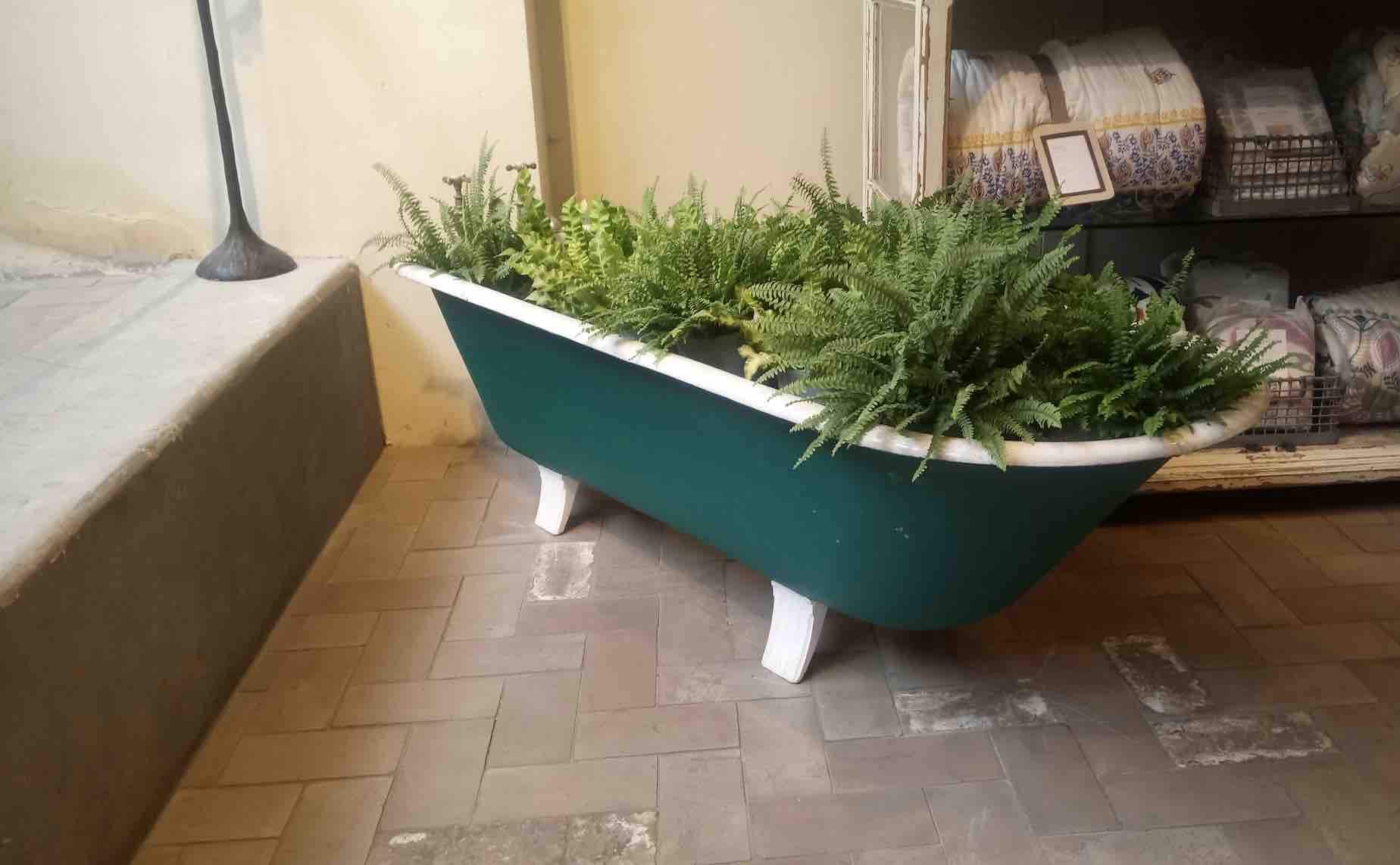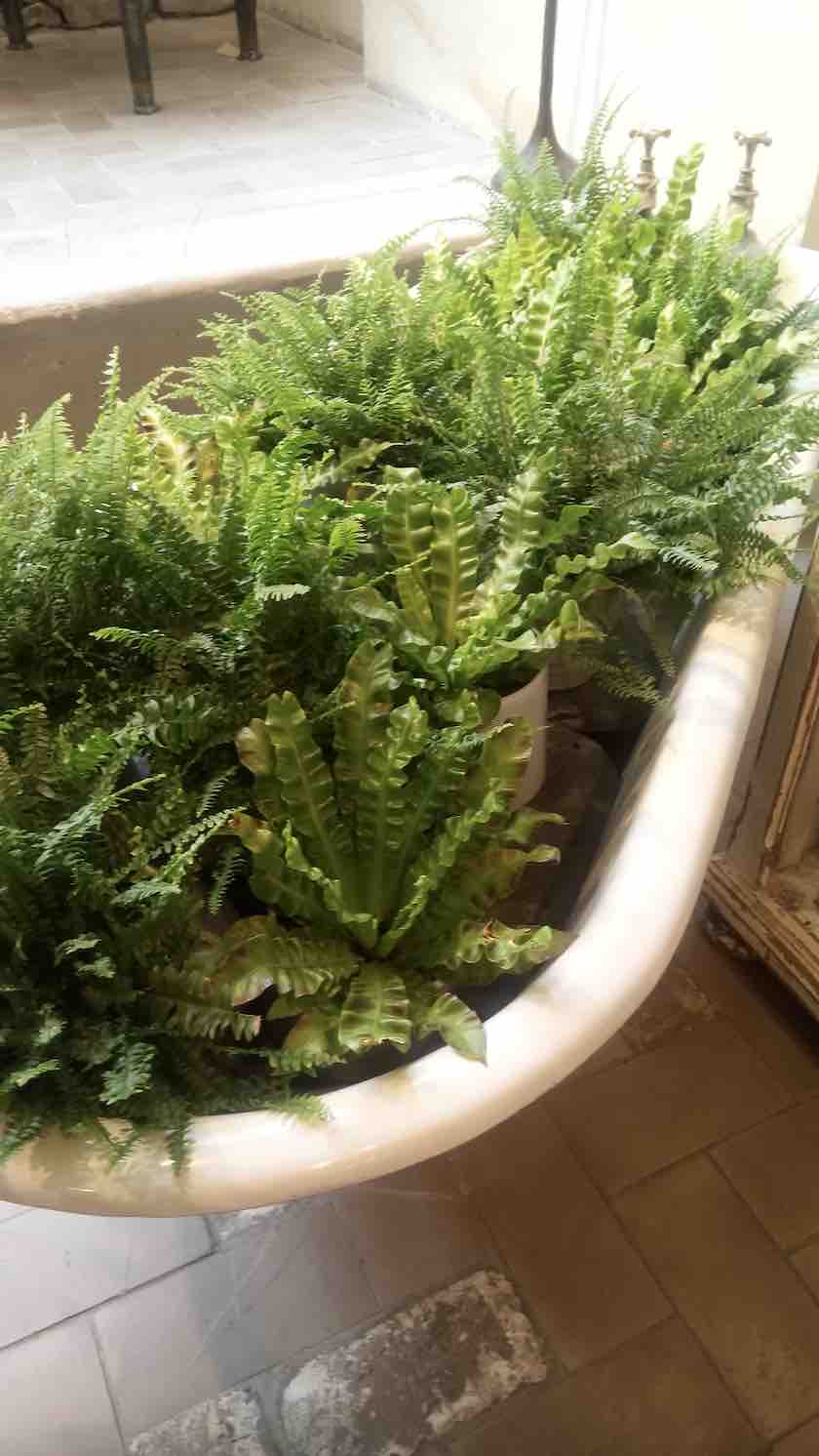 This is another of my favourite categories to search out because old sinks make excellent doorstep planters. Salt-glazed or ceramic, they come in all shapes + sizes, from Belfast sinks that would have been an integral part of our ancestors kitchens to lab sinks that have probably been part of an experiment or two. I’m planning on making a herb garden in one in my new place to keep a steady supply growing. Alternatively, If your small space will allow, an old bath is a statement planting option that would require little else to create a particularly eye-catching design. Layer up the planting to get multiple seasons of blooms in one ‘container’ so that the bath planter works hard for your garden. Below is a fern-planted bath to give an idea of what could be something really playful in the right place. Small spaces often mean lack of storage is a potential issue, so by making your pots as multi-use as possible it will negate the headache of where to store spare planters when not in use + in this case… a bath!