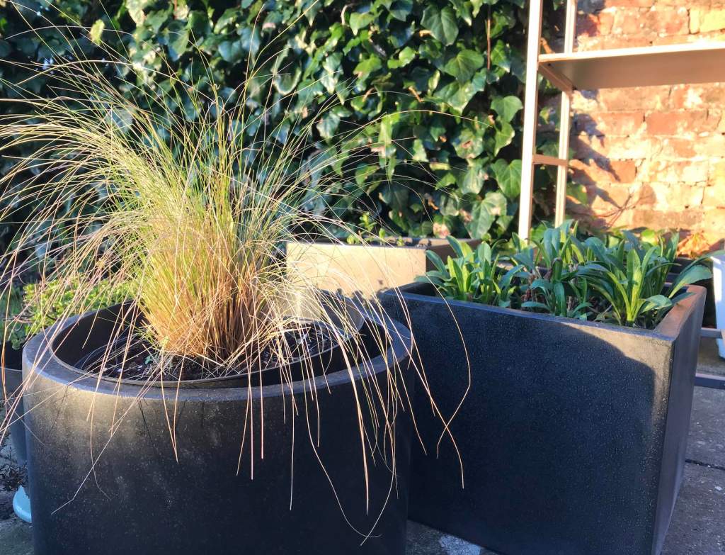 This is a great starting point if you have a corner to occupy with pots because you can consider using things like feeding troughs, water tanks + industrial-looking metalware. These can sometimes be larger in scale but there are lots of options for smaller spaces. Dolly tubs + bins are readily available too + are a nice size to work with in the corner of a restricted site (see below). These types of containers are generally not too heavy but remember they will weigh considerably more when planted up + watered, so be mindful of this if you are on a balcony space! Equally, if space is limited, a run of troughs or tanks to create the look of a raised bed can look great. These are a savvy choice for small spaces + for those that need their setup to be flexible + moveable. For a vertical planting idea, smaller metal containers can be drilled to the wall or used with suitable fixings to create a window box situation.