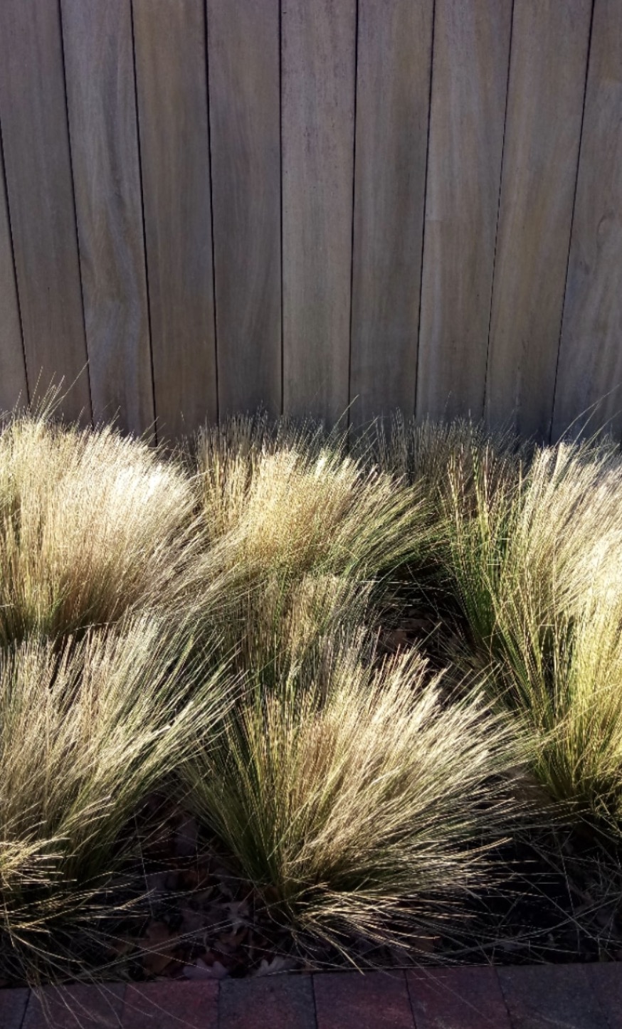 If I can, I’m planning on building a narrow-ish raised bed for my grasses etc. to raise them up from ground level so that I can appreciate their wafting nature from a better position. Because right now, my horsetail grass looks best when I sit on the floor of the patio! So don’t be afraid to elevate your planting, even if space in limited — it adds dynamism + depth which can make a space feel bigger! If height allows, another option that I really like is incorporating seating into a raised planter — such as building a bench fixed to the wall with a stepped up back that is planted with pampas grass etc.