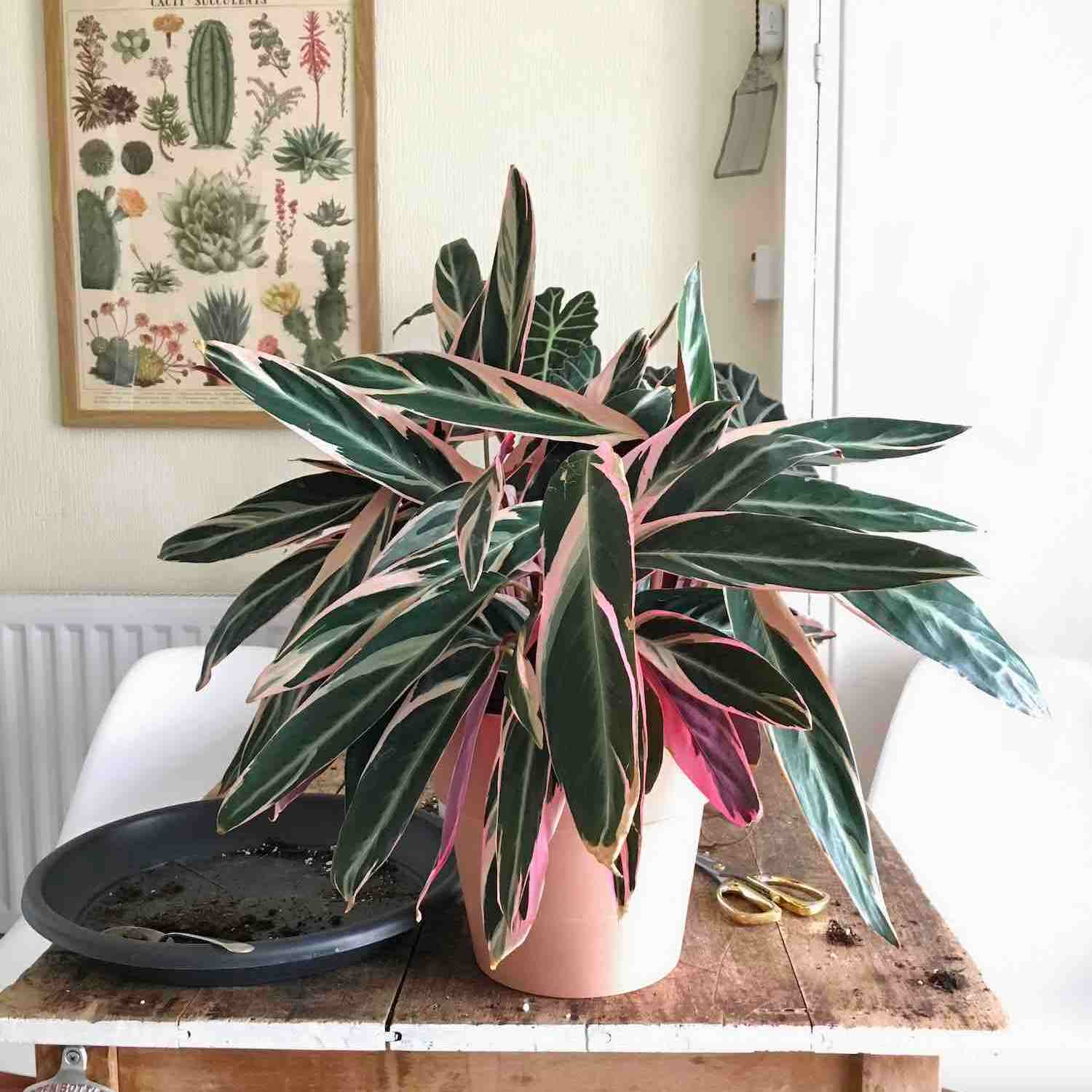 My Stromanthe is another of the older plants here at HPH + it’s grown with me from my academia days. Then, it was a smallish plant that didn’t have much pink to speak of on it’s younger leaves. It’s a slow-ish grower + for a couple of years, I didn’t give it much attention, but it then got extremely pot-bound, which forced me to take notice. This re-pot seemed to be just what my lovely plant needed because it really has flourished over the last 2 years. The leaves are more evenly variegated + pinker now + I propagated by division so that I have two of these here at HPH. If you love the look of Calathea but want something more robust, I’d highly recommend one!