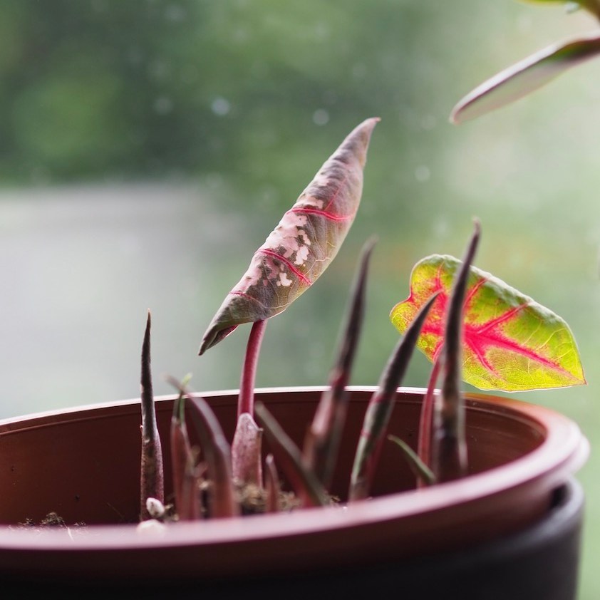 Ah, Caladiums. They’ve taken the houseplant world by storm over the last 3 years + with foliage that looks this good, it’s unsurprising. They are a great shade loving plant outdoors if you have a milder climate too. I’ve grown a couple of different varieties + I must admit that picking out tubers to order does feel like you are in some sort of plant-y shop of treats! They come in all different colours + patterns, which makes choosing just a few difficult, but I find myself getting drawn towards the pink (or white) cultivars — right now I’m loving Spring Fling, Carolyn Whorton, Miss Muffet + Sizzle. There’s something about the tissue-paper leaves that maintain their translucence in the lighter variegations + if you are intrigued in growing houseplants from tubers, these are my top pick.