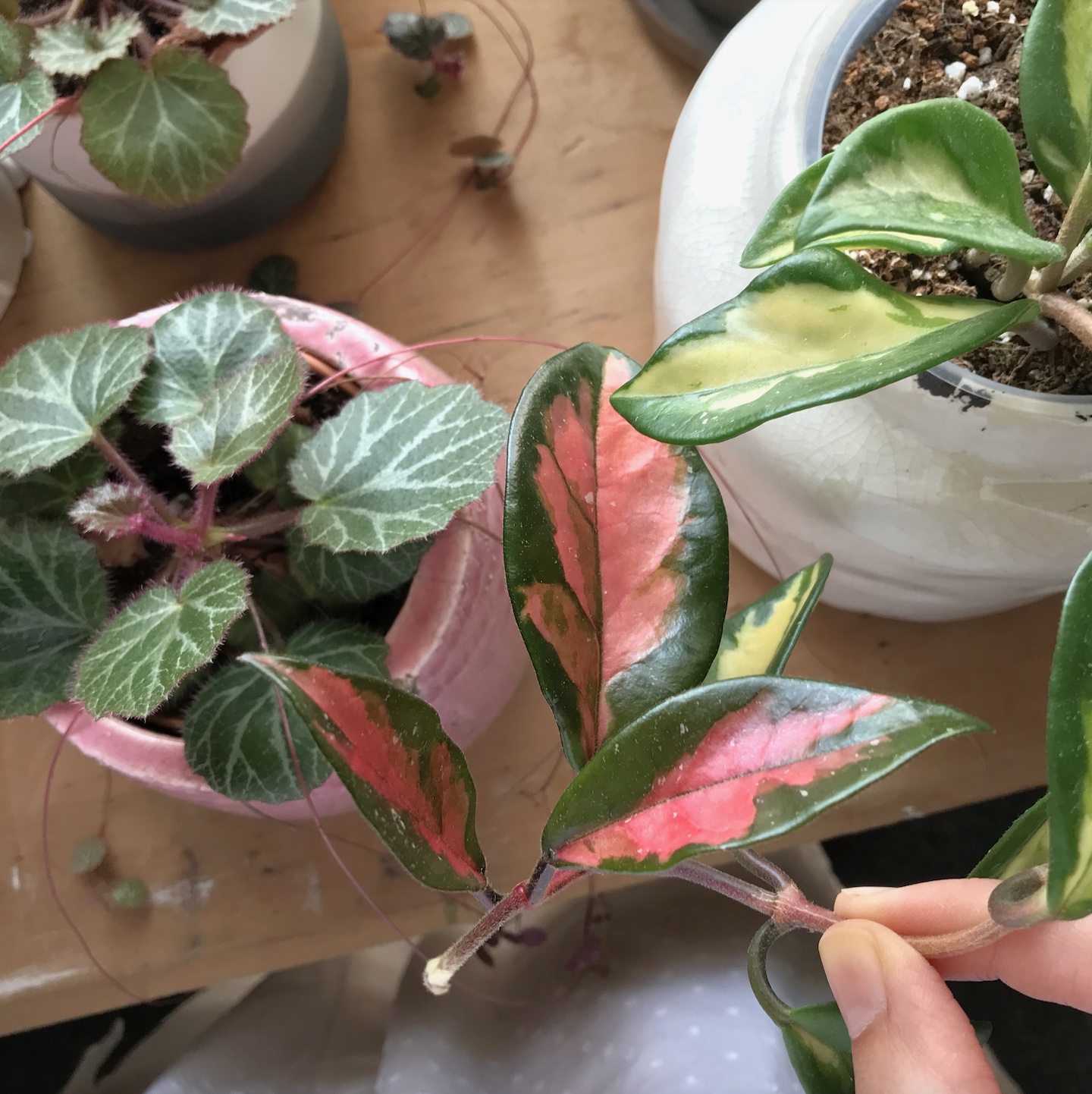 I’ve really been getting into Hoyas of late. I’ve still only got three, but I am certainly going to add to my collection if I have the space in my next place. I’ve found them to be so forgiving + their slow-growing nature suits small-space living well. This little carnosa tricolour has been with me since it was a baby plant with just a couple of leaves + it’s been very resilient in testing conditions. Most recently (yesterday) I was packing some boxes ready for moving + knocked the plant off it’s shelf… as you can see in the photo below, it lost half of its leaf! But other than that, it came away unscathed. This one has lovely pink variegation, which means it needs more light than the less variegated types, but I’m looking forward to seeing how this one develops over the next few years. As small plants, they are a good candidate for styling on a plant shelf too!