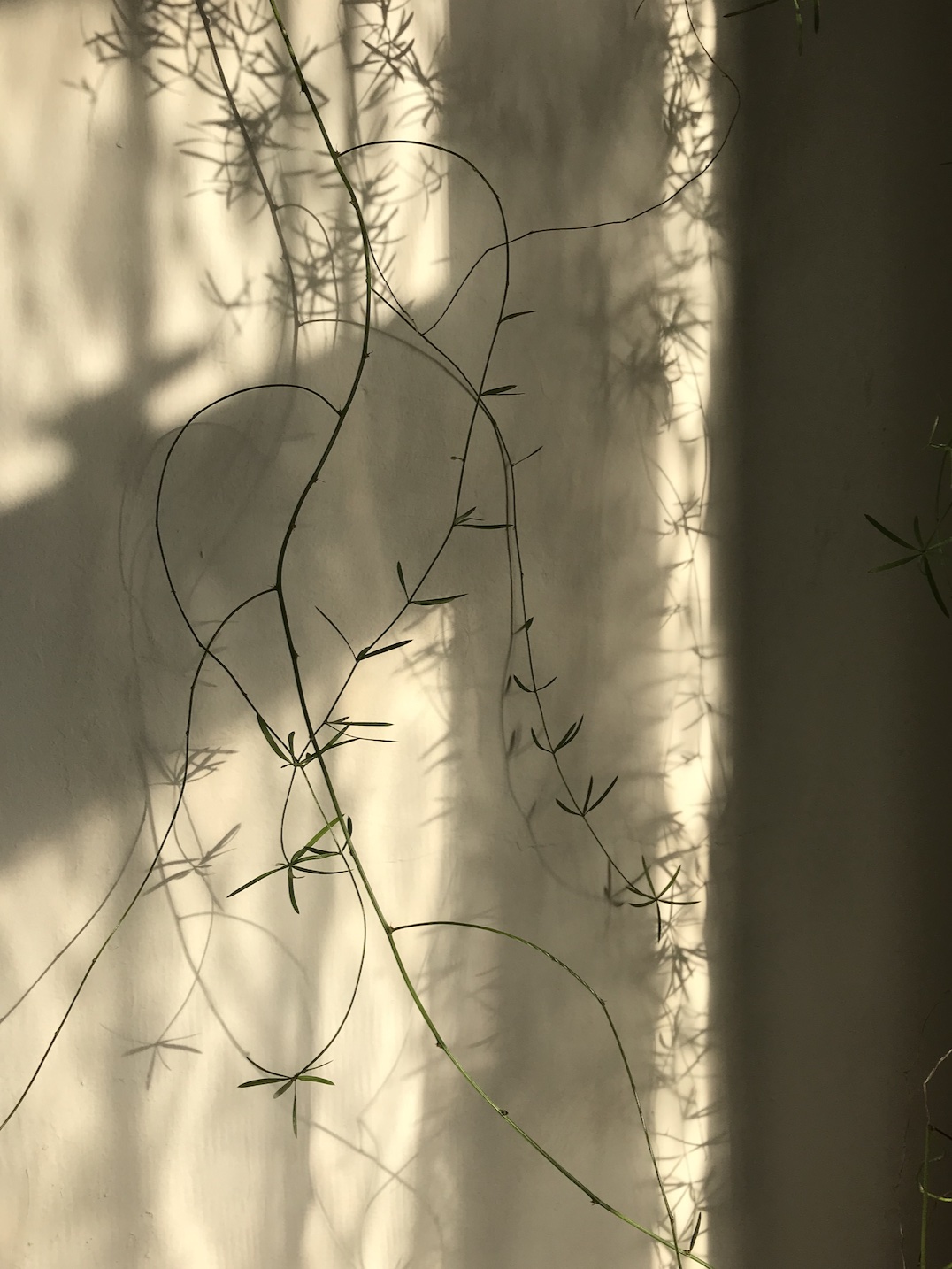 East-facing locations are brighter than Northern rooms as they get the lovely light from the morning sun as it rises + are often a good choice for bedrooms if you are designing a space — they are generally considered ‘medium bright, indirect light’. For plants, these spaces are quite adaptable + are great for your trailing displays or leafy gang because by the middle of the day, the sun will be higher in the sky + moving away from this area. This means that in eastern exposures, I can grow things well in closer proximity to the window because the light intensity isn’t strong enough to burn or crisp the foliage. In the cottage, the windows were South-East facing which made them a key area of the space to keep my plants (other areas were quite dark).