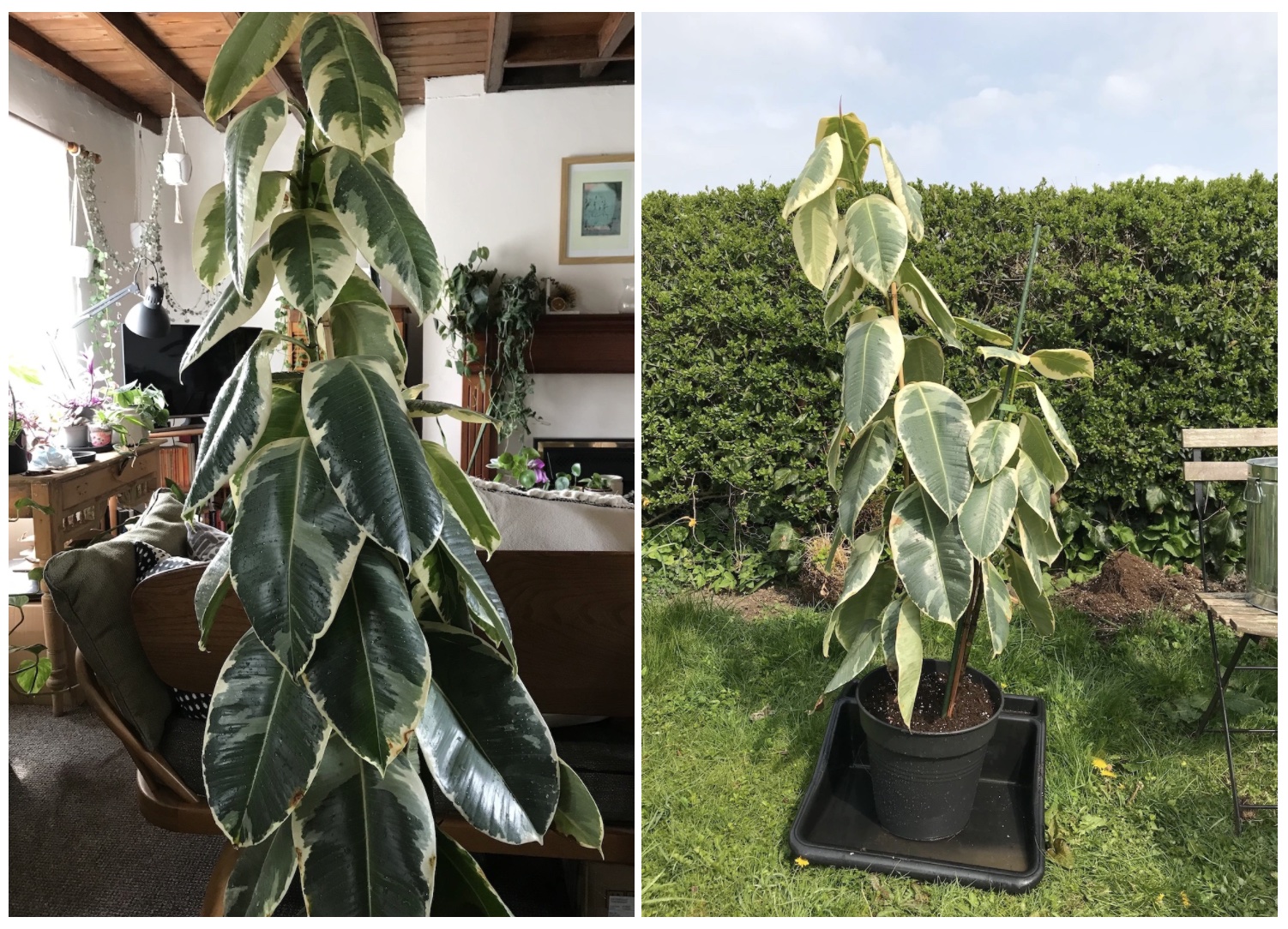Next, I wanted to do something about my two more mature elastica tinekes that have been growing with me for quite a few years. The thing is, Ficus plants really dislike getting moved + can go into shock, especially in colder temperatures. When I re-located in February 2020, my largest plant was not amused at all. And for 16 out of the 18 months I was staying in the cottage, it didn’t grow a single new leaf. Nothing. It just sat in the corner like some sort of statue! During this time though, I need to add the disclaimer that it was very cold as the heating was useless, so I know it was dormant for quite a few months (they commonly do this). My other Ficus gang also went dormant but sprung back with a period of active growth over Summer 2020 + then again in Spring 2021, as is typical for these plants. This big one though, still nothing. As a last-ditch attempt to jolt it into action, I decided that I would pot my stroppy plant alongside my other medium one — that’s the two plants in the photo below left. The next two photos are from the corresponding Repotting Diaries post + show them together in one pot: