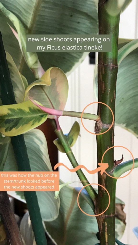 My plan with this plant was to also do some top-pruning like with my smaller pot earlier in the post to encourage branching, but within the last couple of weeks, I noticed something pretty exciting that I’ve never experienced first hand before… my plant was growing side shoots! You might have noticed a little bumpy nub on the stem/trunk of your Ficus around the point that any leaves or branches join the base of the stem, these are nodes. As you can see in the close up of mine below, this is where the new growth appeared: