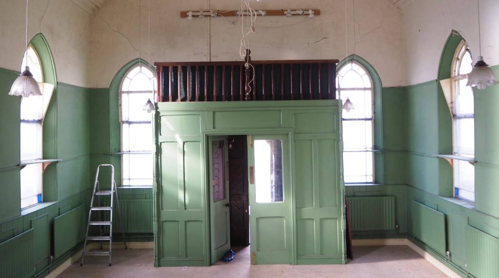 After spending months drawing out initial ideas before getting the keys, to actually stand in the place with it empty and see it in three dimensions was completely bizarre! Here’s a view from the pulpit, looking out towards the doors which are through the vestibule. The vestibule wasn’t original to the Chapel from 1879, but was a later addition from another Chapel in the locality.