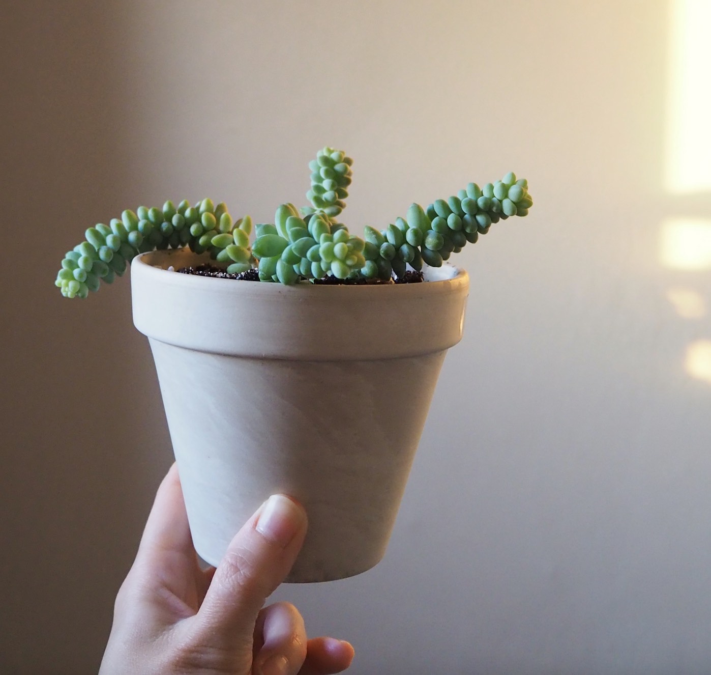 The Sedum morganianum/Sedum burrito are some of my favourite trailing succulents + they are a lovely, easy going plant that will thrive in a west facing window. The morganianum has longer leaves (photo below right) + the burrito leaves are shorter + more rounded in shape. I’m planning on hanging both of mine in the window from a hanger + as the plant matures, the stems will trail down + they can look really interesting! Any fallen leaves can be popped back in the top of the pot to propagate + new growth will develop from these to fill up the pot. It goes without saying that as a succulent, it’s a slow grower, but I always like to think that it’s an opportunity to practice patience! These pots below, I’ve propagated, but you can pick up a more established pot if you have the budget of course.