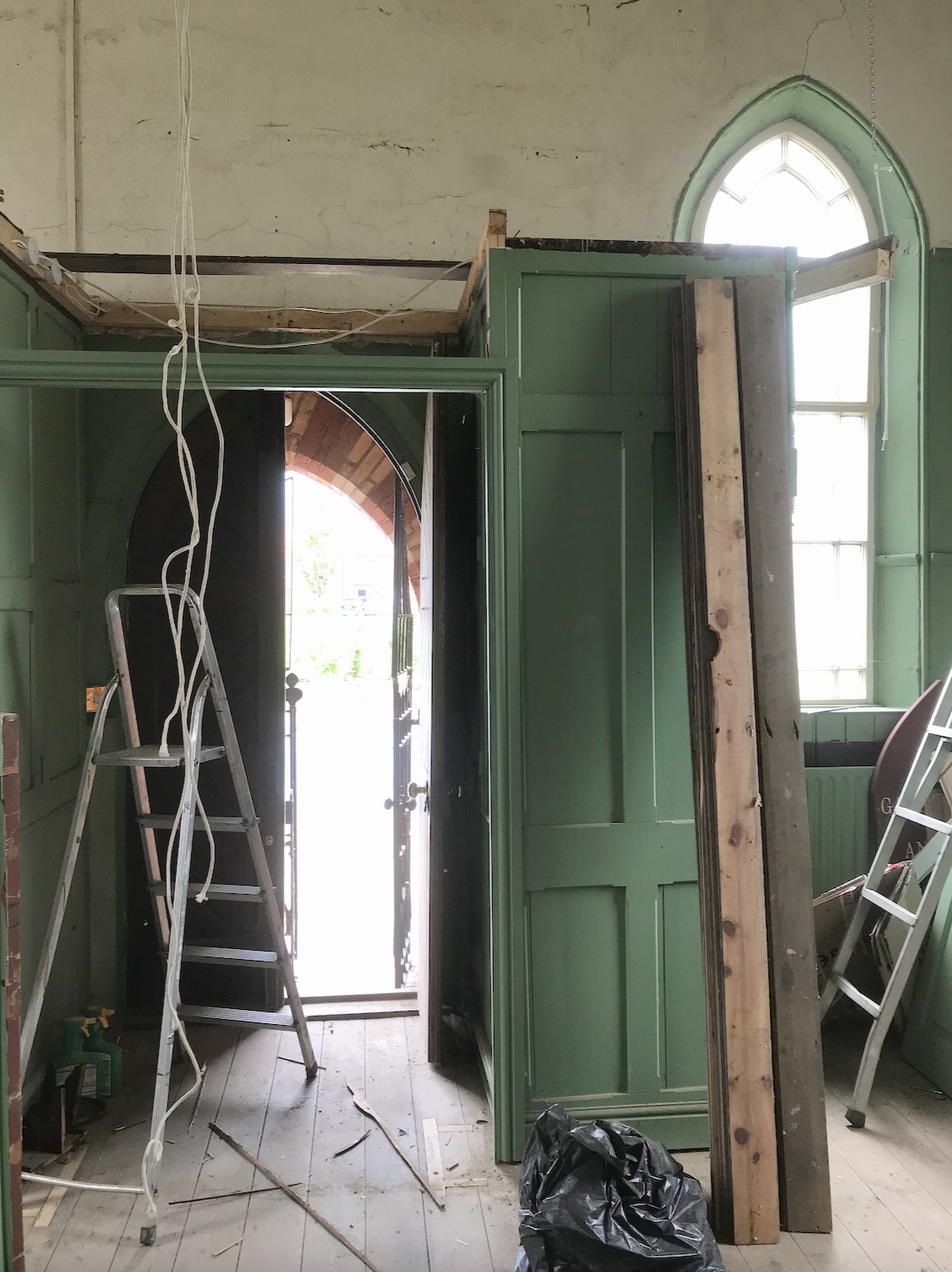 As I mentioned in a previous reno diaries post, the vestibule that sat at the front of the Chapel wasn’t original to the building but a later addition from another Chapel. As we started to take the structure apart, it became clear that there were lots of parts we would be able to re-use and incorporate into the new design which I was excited about. It was of a lovely pitch pine construction + had been installed well + took some effort to dismantle so that everything remained in good condition to re-purpose!