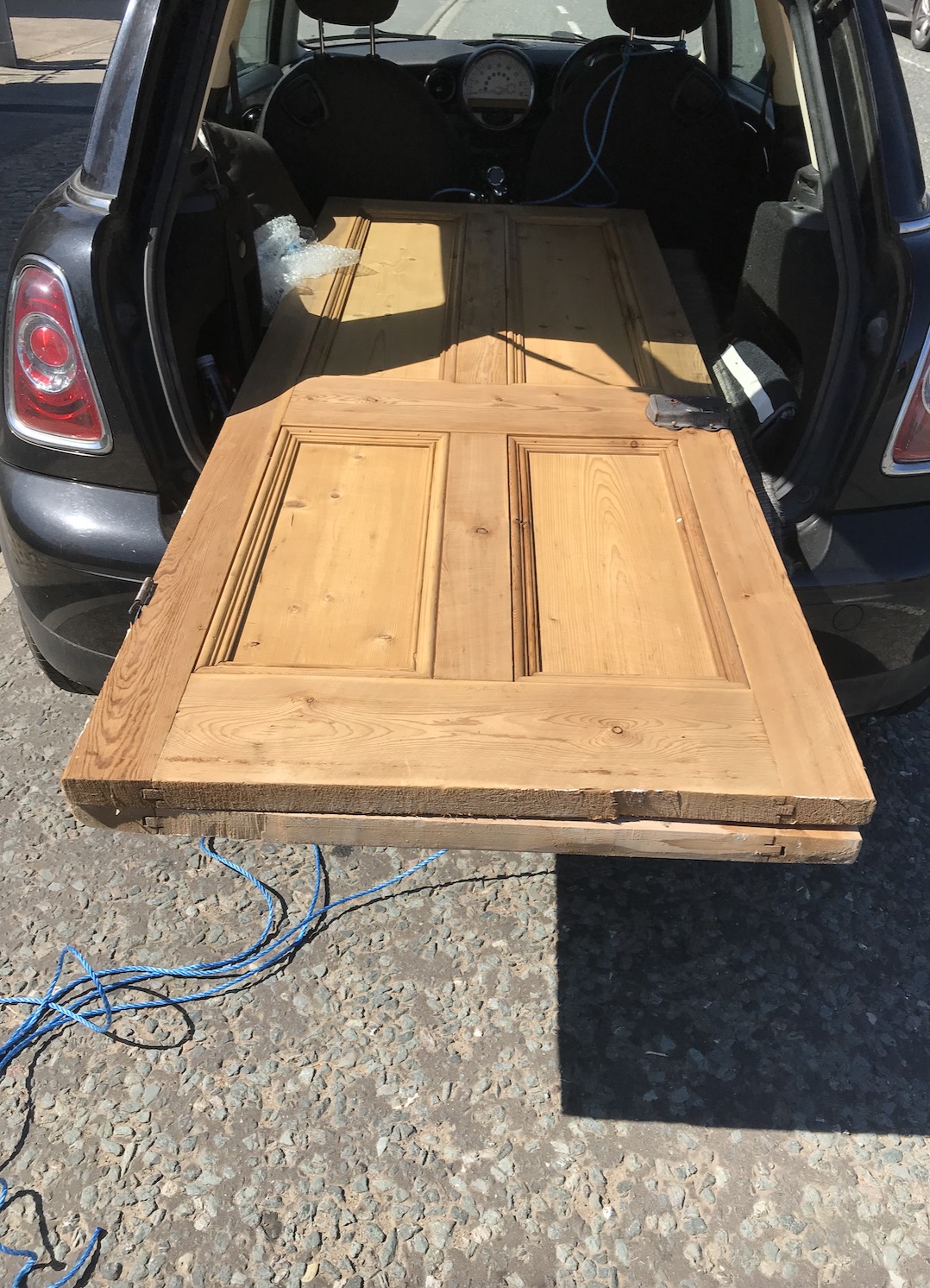 After finding those little windows (in the previous post) I was planning on using two as borrowed lights above the internal doors (I’ve included a sketch further down), we needed to find some doors that would work with the dimensions — we visited a couple of salvage places until we found a great dipping place + managed to score two Victorian pine doors that we could get dipped. After my ongoing sanding escapades with the double vestibule doors, I was happy to get these paint stripped in a tank! I still had a LOT of sanding + paint stripping + wood-worming to do to pieces that were too large + heavy to fit in the car + transport, so on balance, I didn’t mind getting these two treated. One of them was slightly narrower than the other which was perfect for the cloakroom measurements I was working on + they fitted in well with the borrowed lights too.