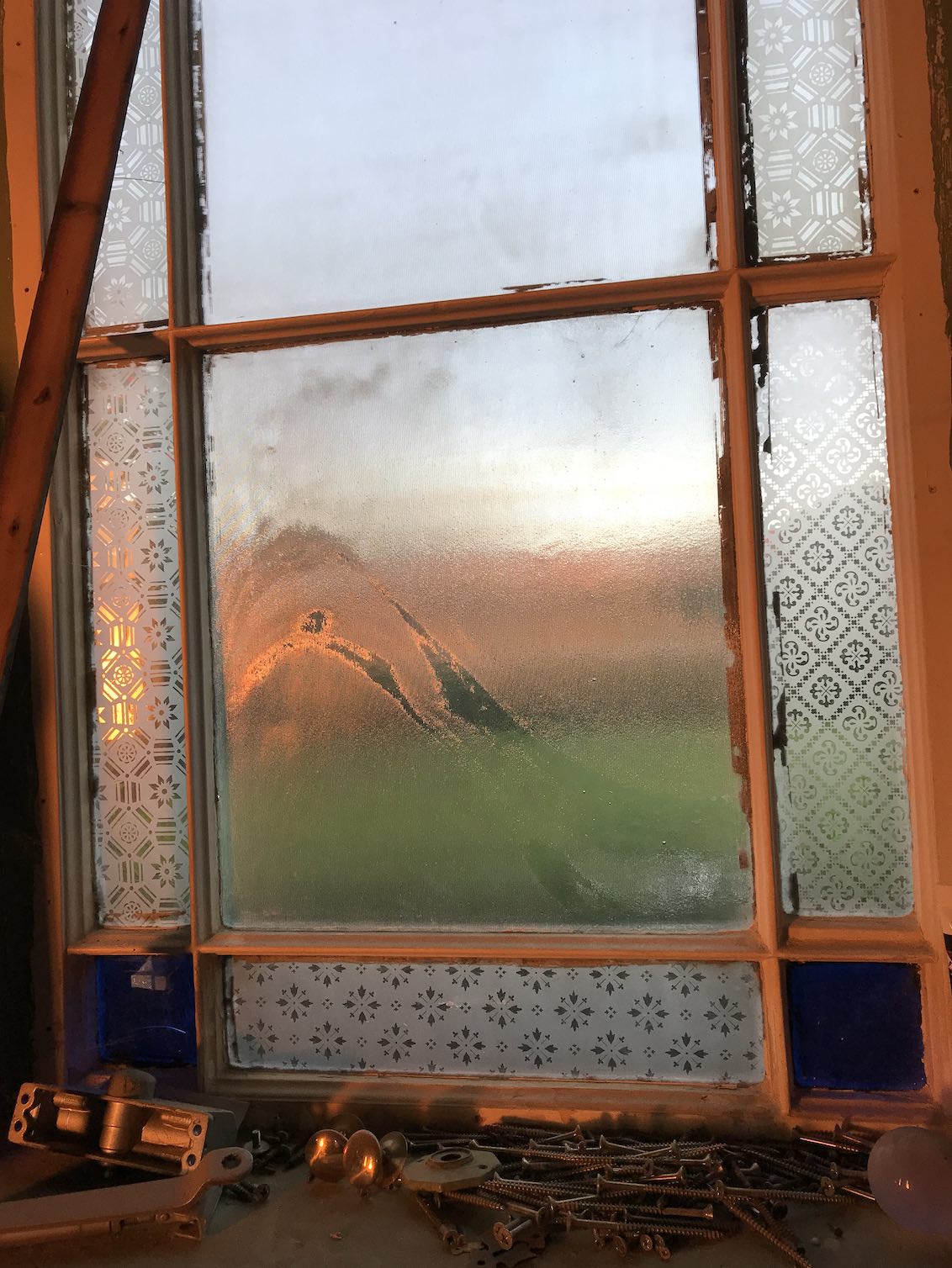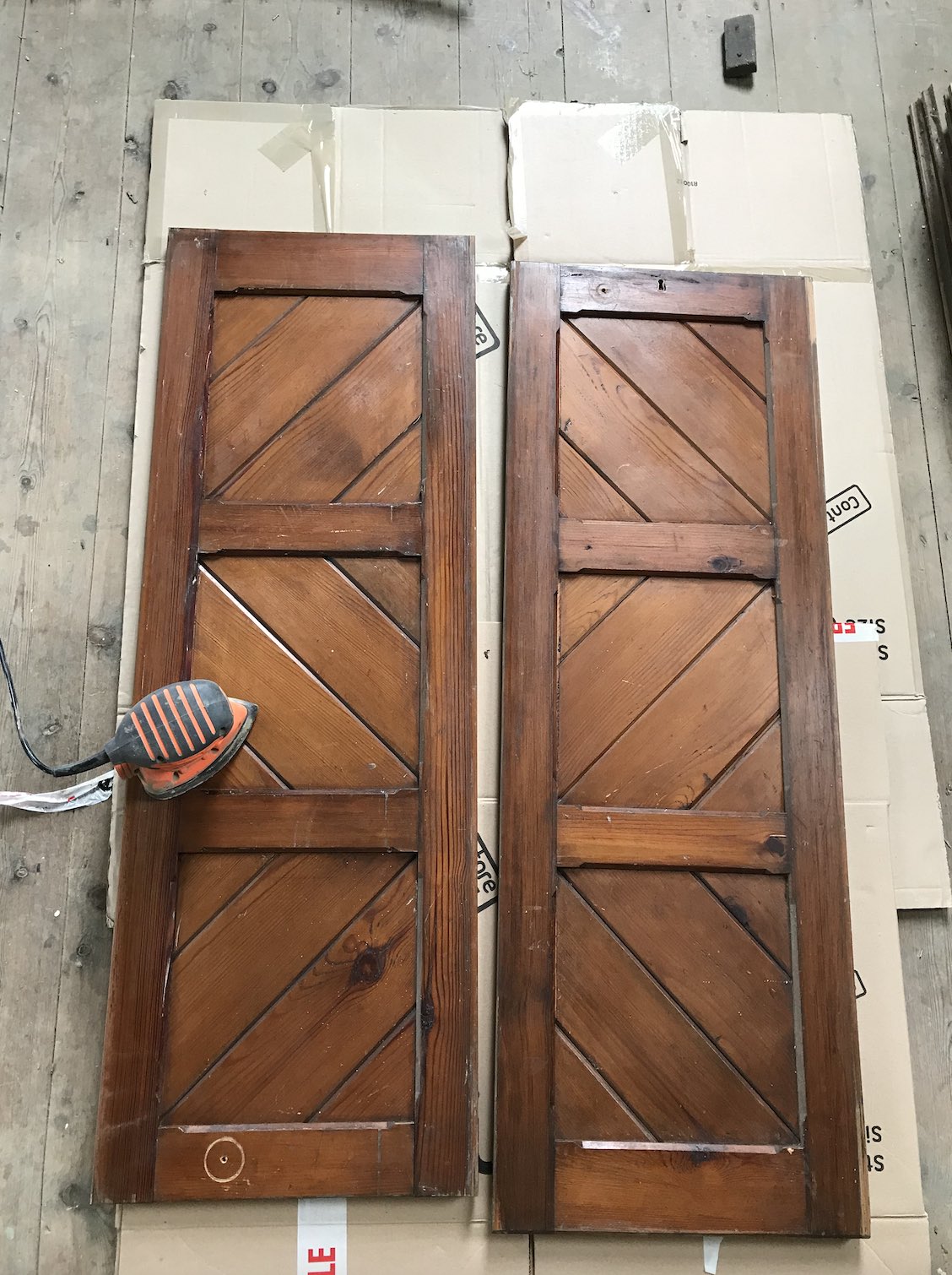 Below were some of the other lovely panels inside the vestibule — the two of them were added to the list of ‘Laura’s sanding jobs‘ + I just worked at these slowly over a few evenings! Like the large panel above, they cleaned up really well + we decided they would be nice kept as wood + possibly built into the stud work on the mezzanine, or used as panels that wrapped around the corner of the bathroom (you might have spotted this in the sketch above in the internal doors section).