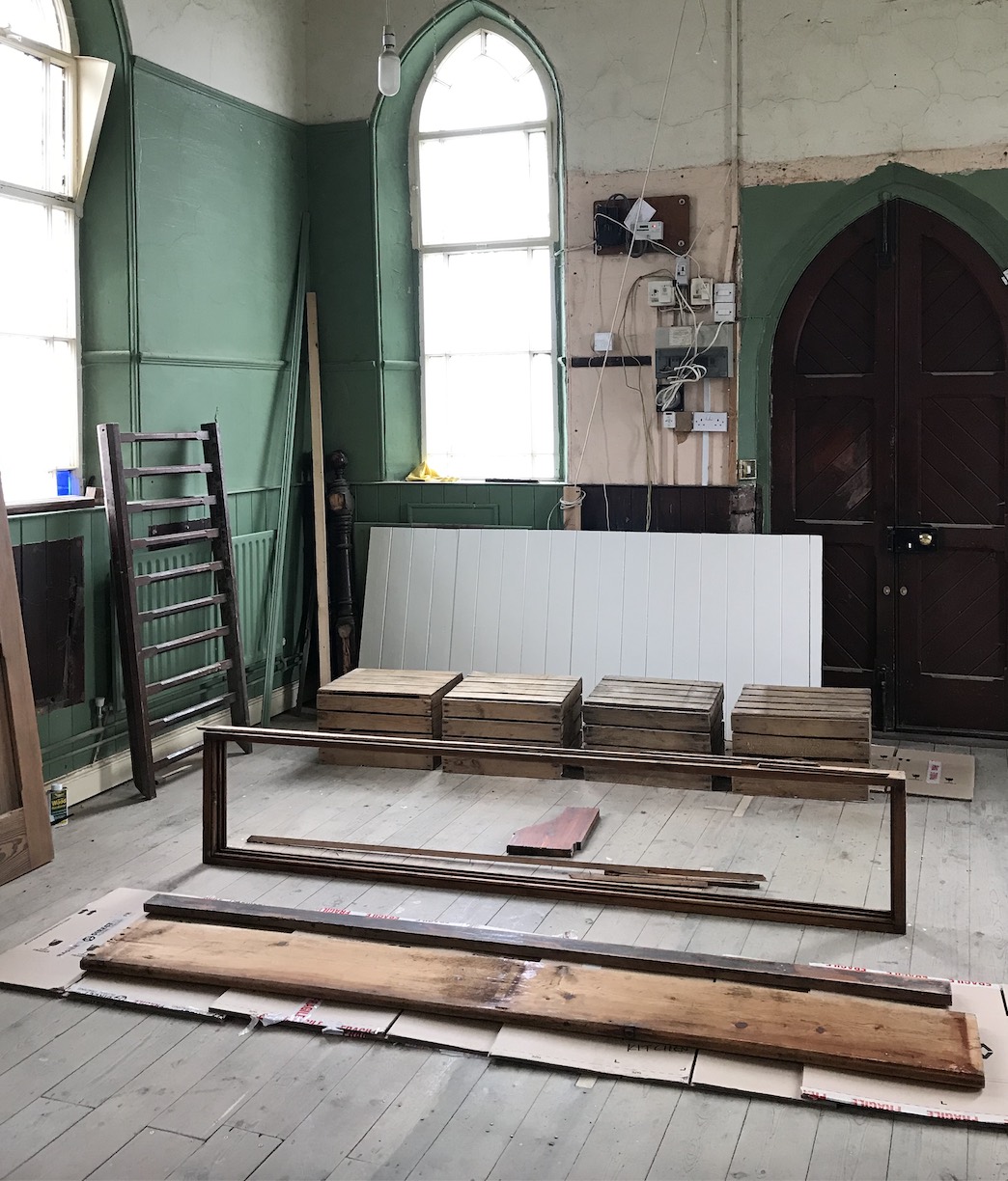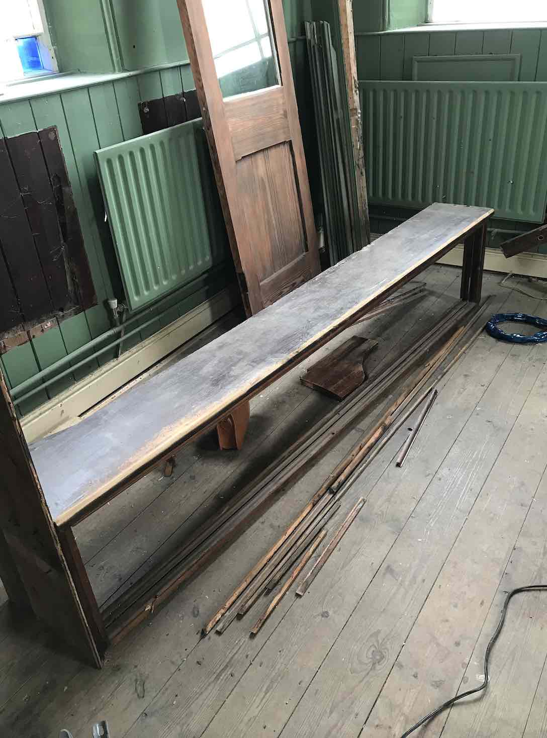 Next we were able to lean the pulpit against the wall while we doused it in woodworm treatment + as it dried, we started to think about where we could incorporate this into the new design. The two ‘holes’ were from the sliding doors (out of shot) which we’d fix up + re-instate, but we’d need to build a new ‘back’ to the pulpit if we were to use it as a screen — we had some Victorian tongue and groove from the vestibule that we could potentially repurpose, but more on that a little later.