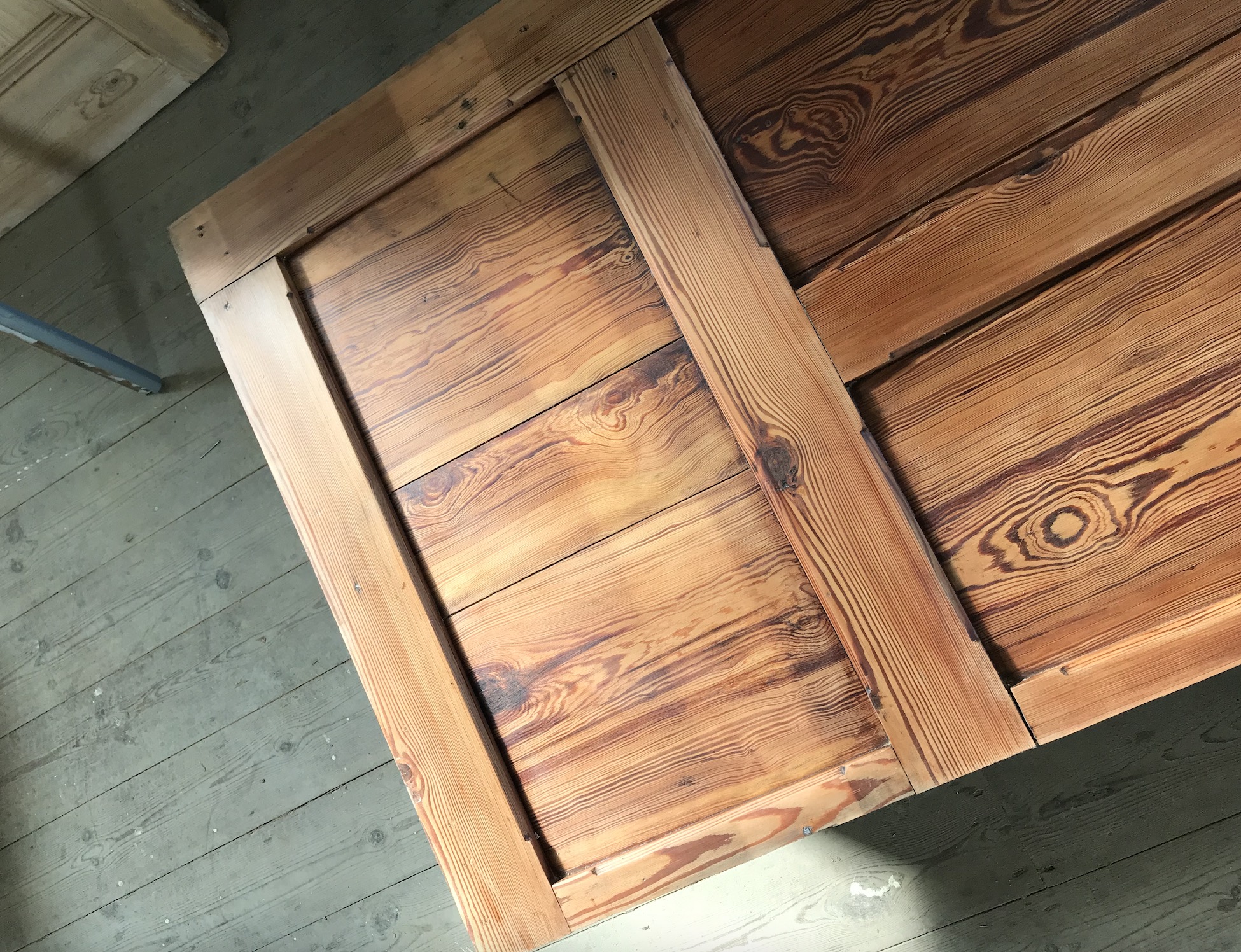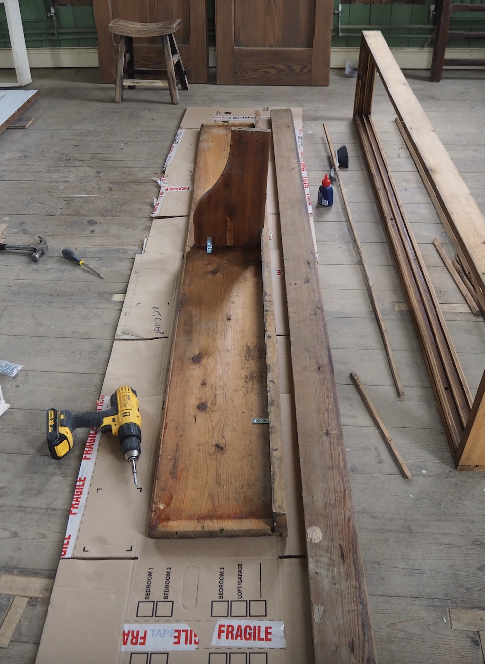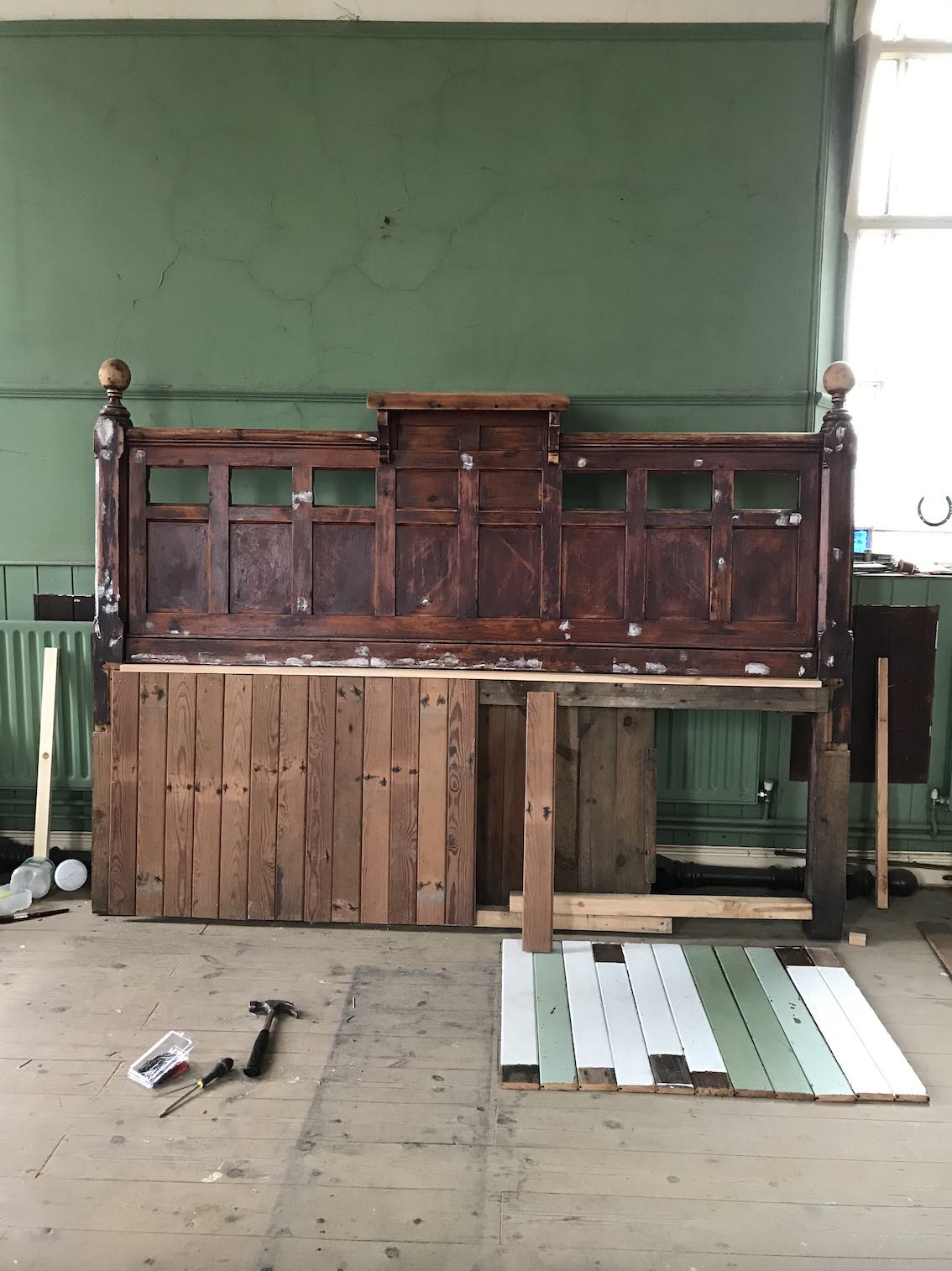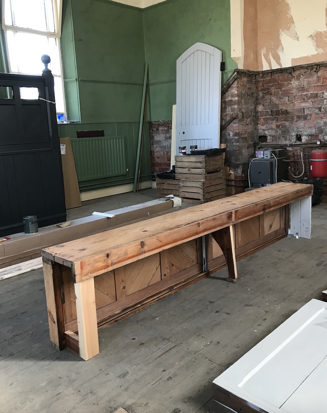 The pulpit bench was a really fun piece to work on and was a welcome change to the heavy lifting we’d been doing for a few weeks with the all the dismantling! Cleaning, sanding + woodworm treatment for all the component parts was the first part of the task — the two sliding doors came up really well, as did the frame, but the seat had some rotten parts that had split + required attention.