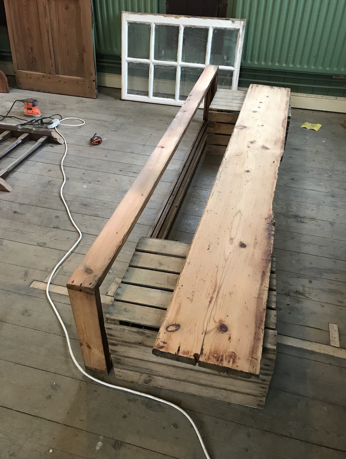 We had managed to salvage the T&G that was behind the bench in the alcove, held together by two batons. This made things much easier to move + we could work on repairing + re-building that + replacing any of the very rotten boards so that we could retain the original look of the bench in the new design. We repurposed some of the smaller T&G to construct end panels for the bench as it would no longer sit within a recess — we had an idea where it would fit nicely but would need to put it into storage until the building works were complete. According to my plans, there was a possibility that the bench would need to get shortened a little bit to fit in the space (accounting for insulation etc.), but this was a long way off yet.