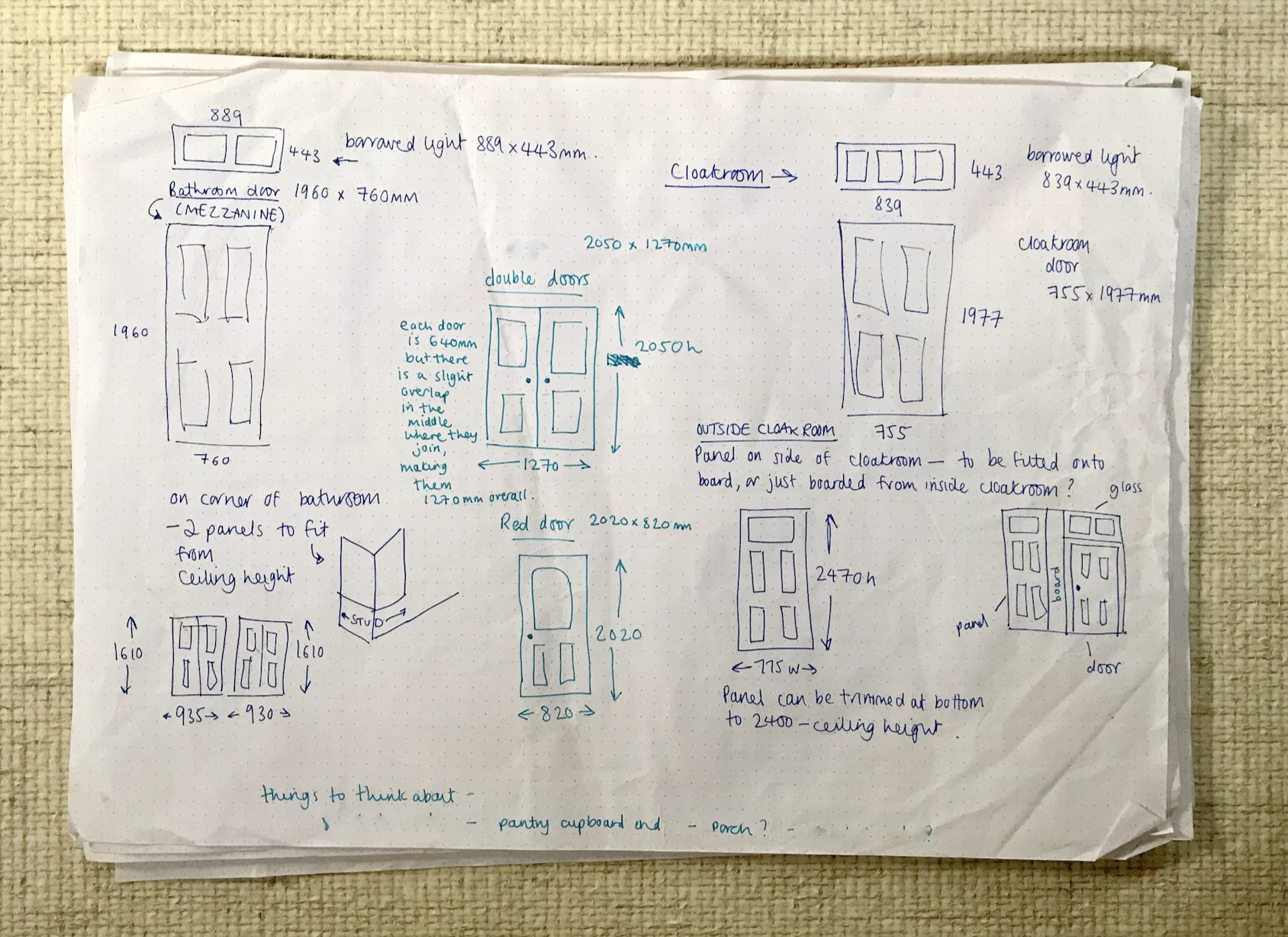From the vestibule, you’ll have already seen the double doors that we’d removed + had been stripping down. These larger panels (one standing below left) were beautiful + we were thinking about using them to construct a little cloakroom as they were the right kind of sizes I’d been sketching…