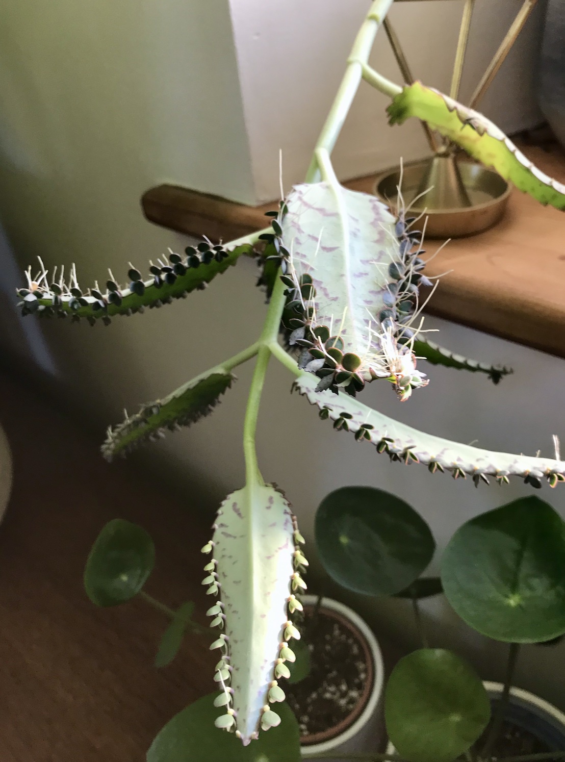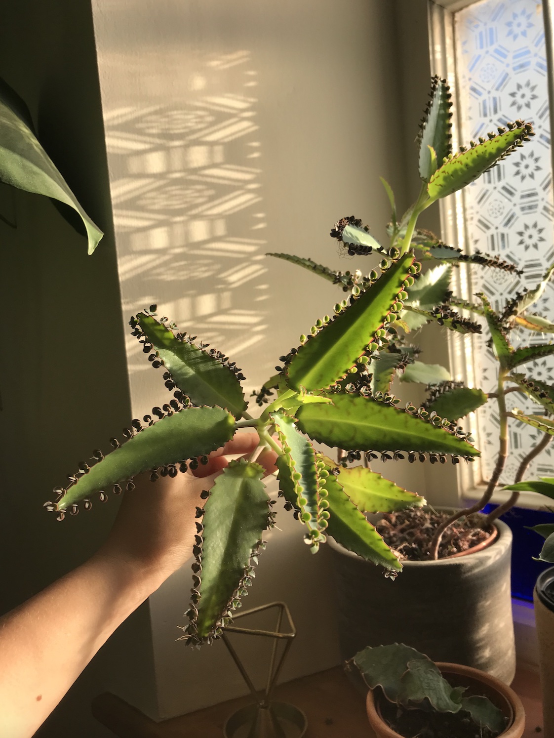 This one came from my friend Craig a couple of Christmas’s ago, who lives in a Chapel in Wales. I remember seeing these growing on his windowsill and as we were leaving, he handed me one to take home. You might know this plant as a Kalanchoe daigremontiana, Mother of Millions, Mexican Hat Plant, Alligator plant, Devil’s Backbone or Bryophyllum daigremontiana. Despite periods of bad positioning in the cottage, this plant is settling in to the Chapel and enjoying life. As you can see, it’s a chaotic looking pot with lots of personality. It’s pretty much taken over the windowsill!