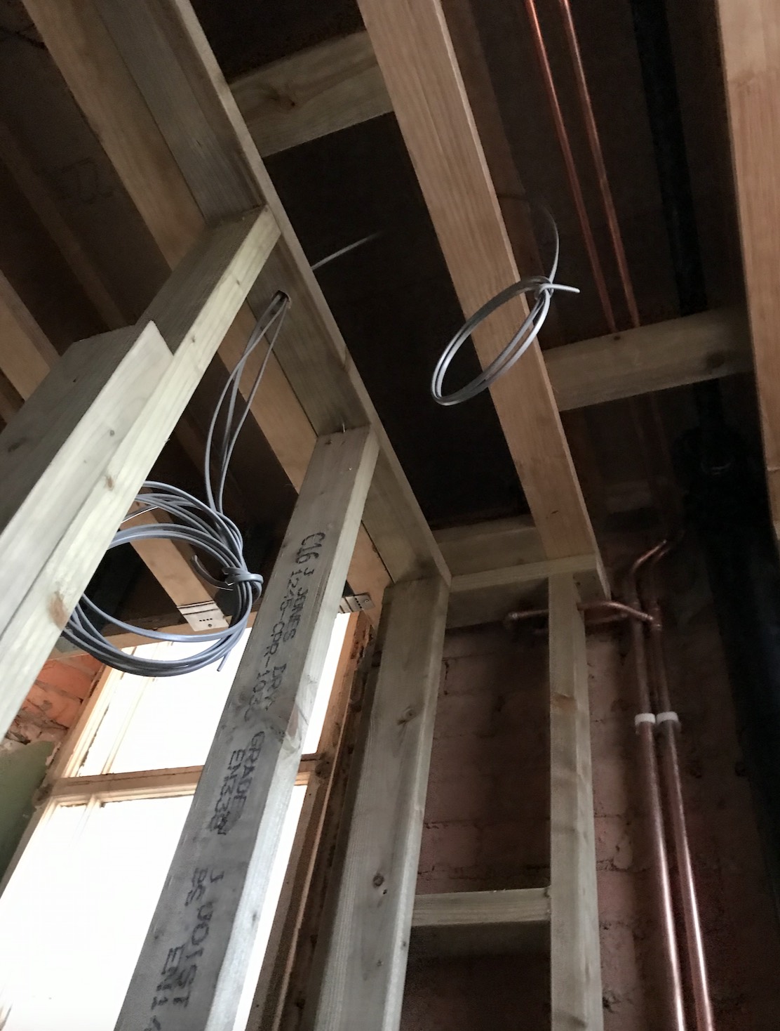 Before the electrician came to work on the first fix, we needed to check our plans and make noggins for the back boxes. We’d planned out the sockets and switches in our drawings of course, but this was the point to check everything. We measured and cut the timber to size before fixing them in. It was also time to look in more detail at lighting etc.